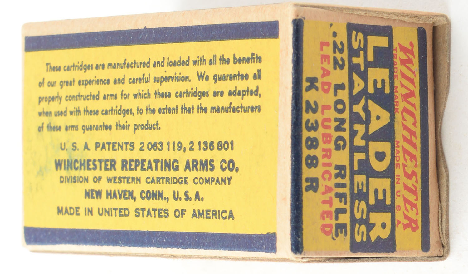 Winchester, Leader Staynless, .22 Long Rifle, RHWeb: WRA-55 LR-1c, Full, 1pc. Yellow blue & red box, box is solid with excellent color, very minor age soiling & corner wear, edges are mostly crisp, end flaps are solid, ammo is very good. Grade: Excellent - Value: 24 to 36