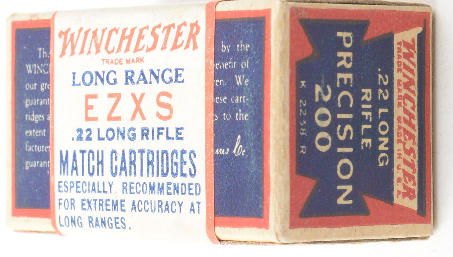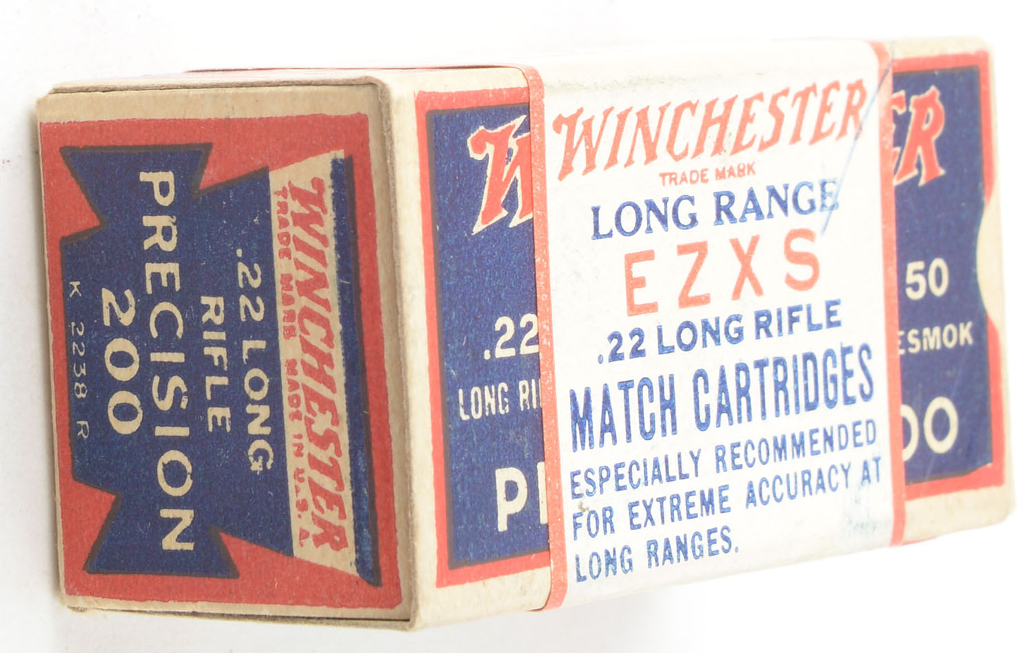 Winchester, Long Range EZXS, .22 Long Rifle, Match Cartridges, RHWeb: WRA-54 LR-1, Full, 1pc. Blue red & white Precision 200 box with white EZXS label, box is solid with excellent color, very minor age soiling, very minor shelf wear to top of label, corners are mostly sharp, edges are crisp, end flaps are solid, ammo is very good to excellent. Grade: Excellent + - Value: 500 to 750