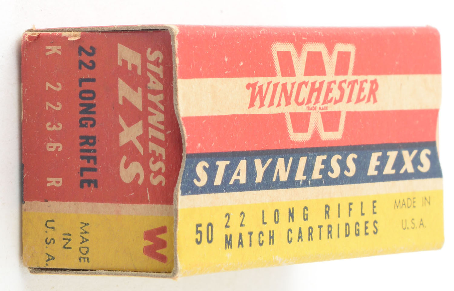 Winchester, Staynless EZXS, .22 Long Rifle, Match Cartridges, RHWeb: WRA-54 LR-6, Full, 1pc. Red yellow & blue box, box is solid with very good color, minor age soiling, very minor shelf & corner wear, end flaps are solid, ammo is good to very good. Grade: Very Good ++ - Value: 24 to 36