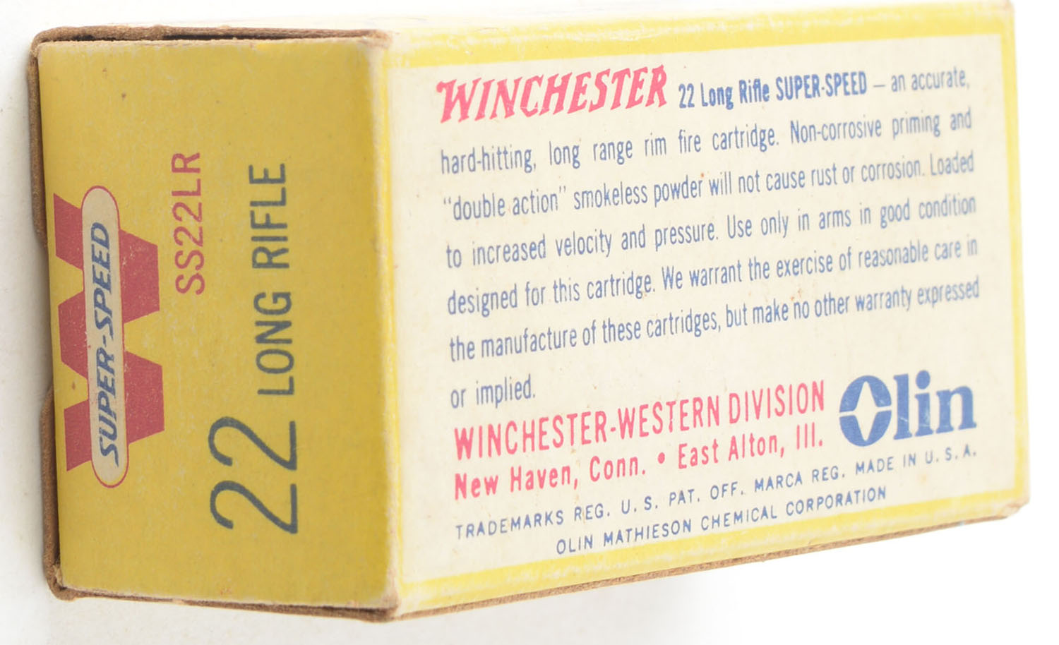 Winchester, Super-Speed, .22 Long Rifle, 40 Gr. Kopperklad Bullet, RHWeb: WRA-20 LR-1, Full, 1pc. Yellow white & red box, box is solid with very good color, minor age soiling, very minor corner wear, edges are crisp, end flaps are solid, ammo is excellent to minty. Grade: Very Good ++ - Value: 6 to 10