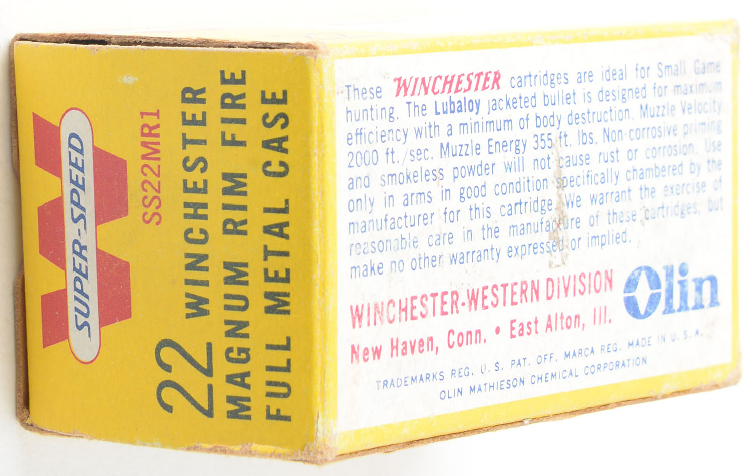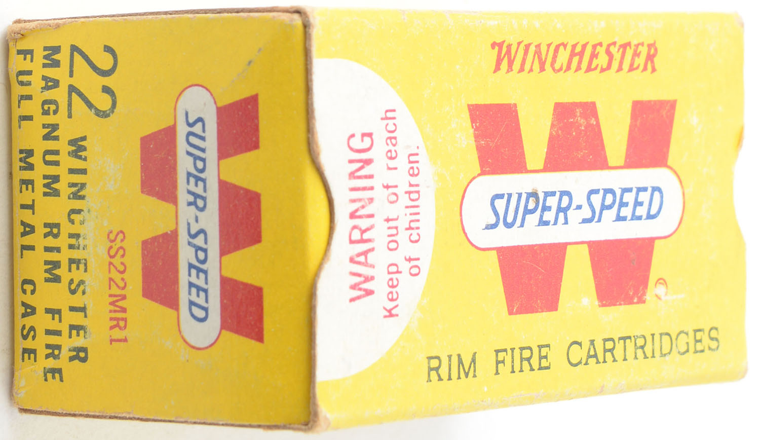 Winchester, Super-Speed, .22 Winchester Magnum, 40 Grain Full Metal Case, RHWeb: WRA-20 WMR-1b, Full, 1pc. Yellow white & red box, box is solid with excellent color, very minor shelf & corner wear, edges are mostly crisp, end flaps are solid, ammo is excellent. Grade: Excellent - Value: 20 to 30