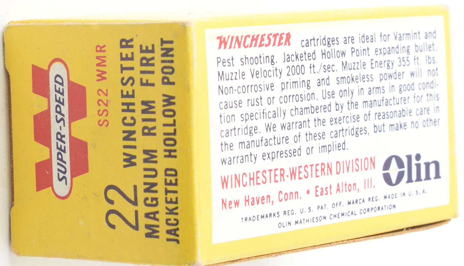 Winchester, Super-Speed, .22 Winchester Magnum Hollow Point, 40 Grain Jacketed Hollow Point, RHWeb: WRA-20 WMR-2a, Full, 1pc. Yellow white & red box, box is solid with excellent to minty color, very minor corner wear, edges are crisp, end flaps are solid, ammo is excellent to minty. Grade: Excellent + - Value: 20 to 30