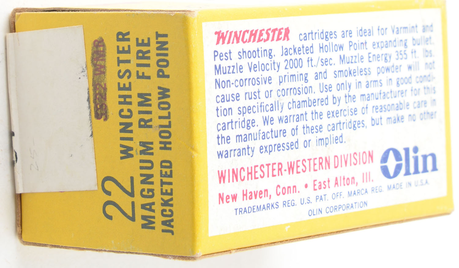 Winchester, Super-Speed, .22 Winchester Magnum, Action Proving Dummy Cartridges, RHWeb: WRA-20 WMR-3, FULL & SEALED, 1pc. Yellow white & red box, box is solid with excellent color, very minor age soiling, left end has been written on, corners are sharp, edges are crisp, end flaps are solid. Grade: Excellent ++ - Value: 20 to 30