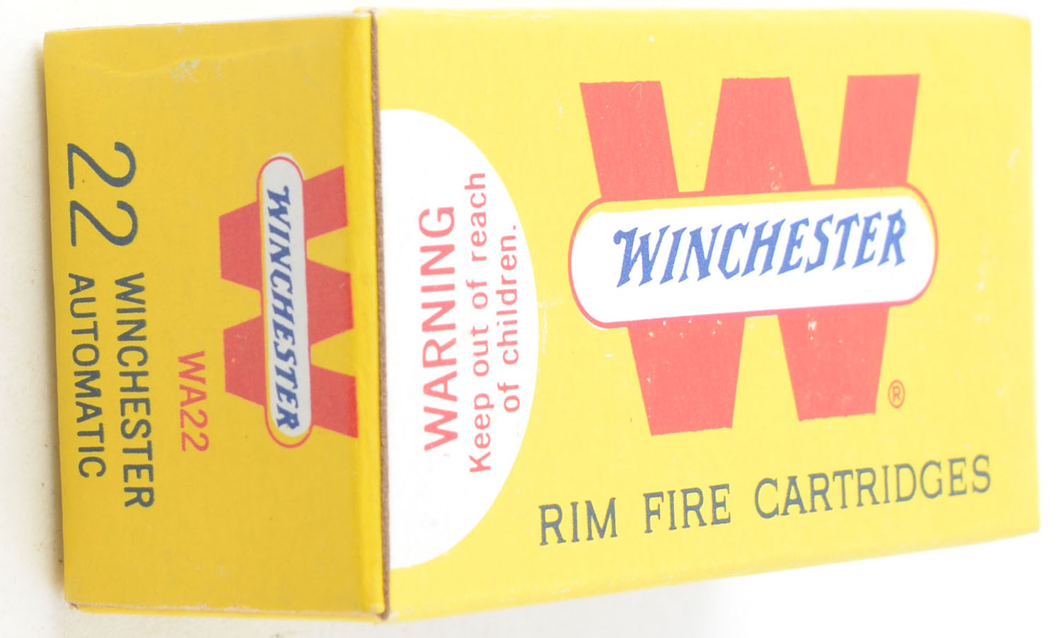 Winchester, W, .22 Winchester Automatic, 45 Gr. Kopperklad Bullet, RHWeb: WRA-20 WA-1, Full, 1pc. Yellow white & red box, box is MINT with minty color, corners are sharp, edges are crisp, end flaps are solid, ammo is minty. Grade: MINT - Value: 30 to 45
