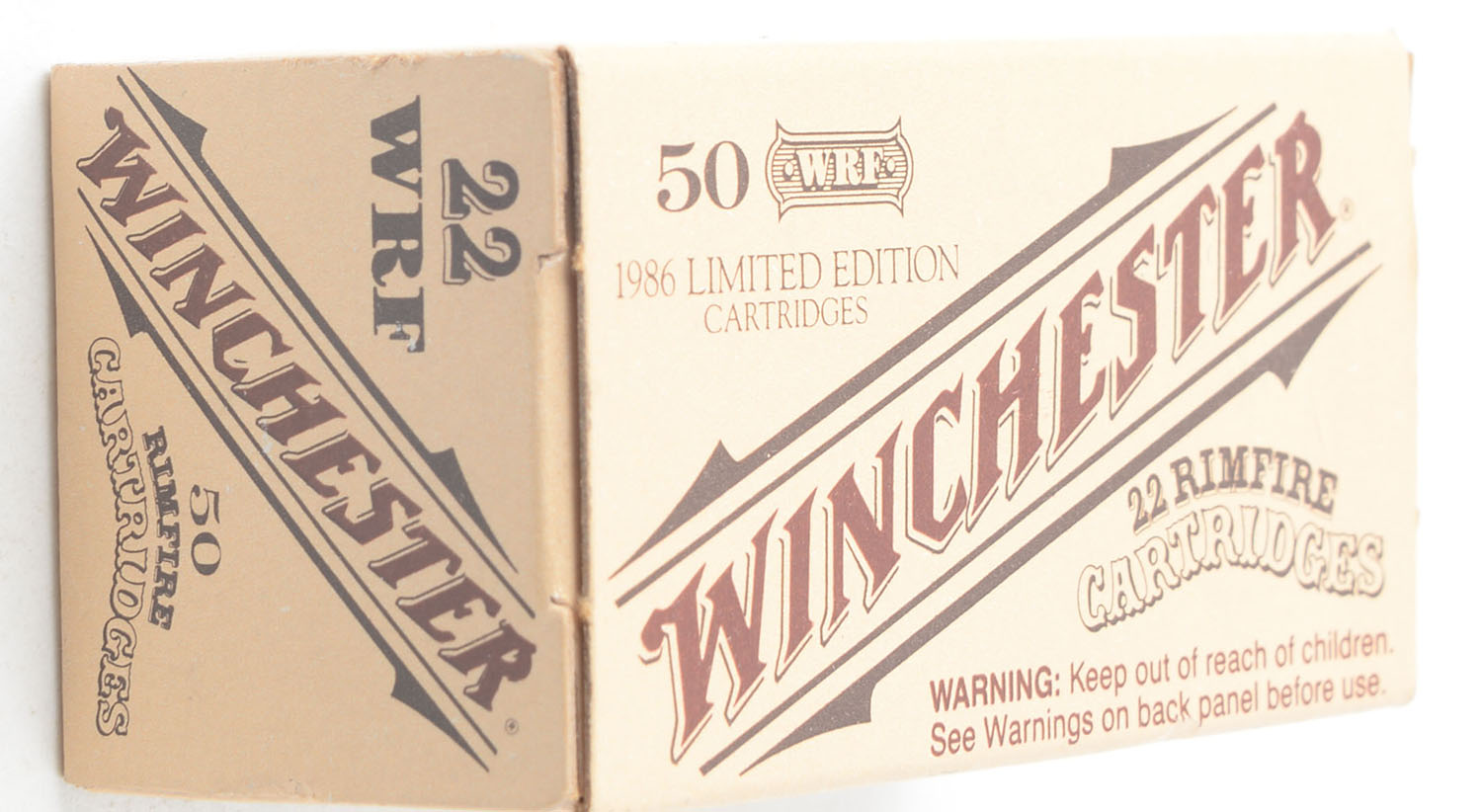 Winchester, 1986 Limited Edition Cartridges, .22 W.R.F., RHWeb: WRA-H&R-72, WRF-1a, Full, 1pc. Tan and brown box, box is MINT with mint color, corners are sharp, edges are crisp, end flaps are solid, ammo is mint. Grade: MINT - Value: 16 to 24