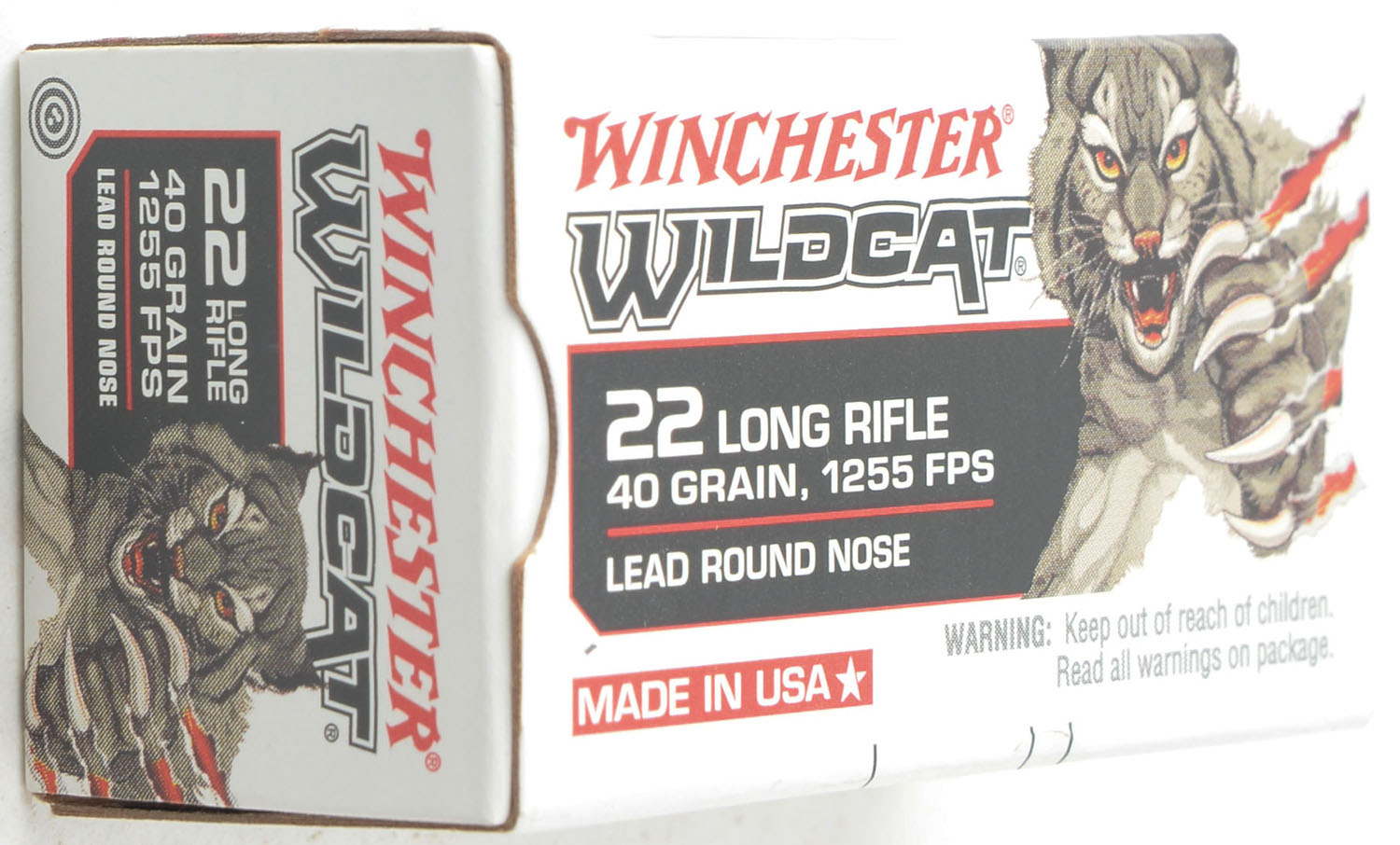 Winchester, Wildcat, .22 Long Rifle, 40 Grain LRN, 1255 FPS, Not in RHWeb, Full, 1pc. White black & red box, box is MINT with mint color, corners are sharp, edges are crisp, end flaps are solid, ammo is minty. Grade: MINT - Value: 20 to 30