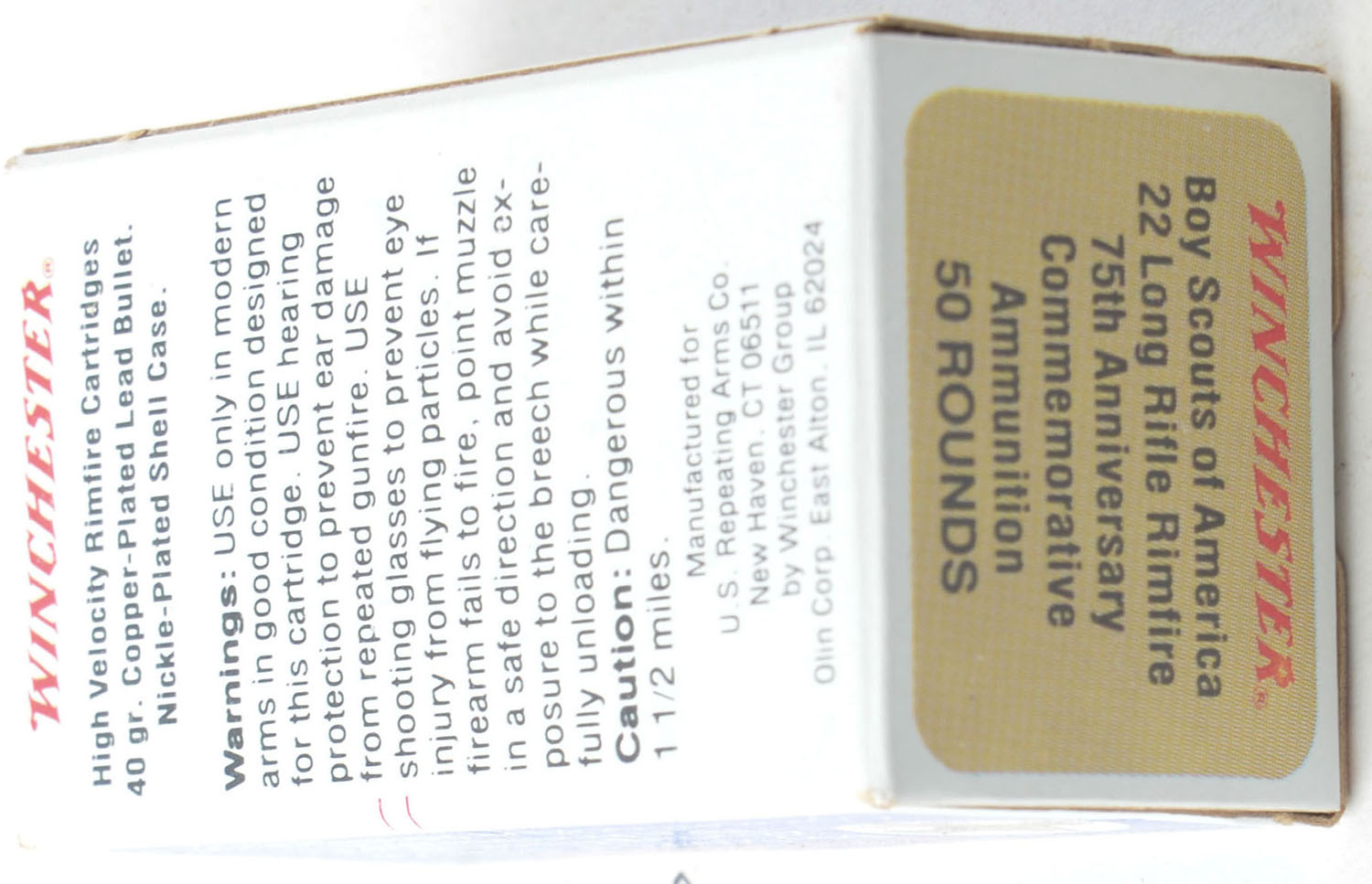 Winchester, Boy Scouts of America 75th Anniversary, .22 Long Rifle, RHWeb: WRA-70 LR-1, Full, 1pc. Multicolored box, box is MINT with minty color, sharp corners, crisp edges, rigid end flaps, ammo is minty. Grade: MINT - Value: 20 to 30