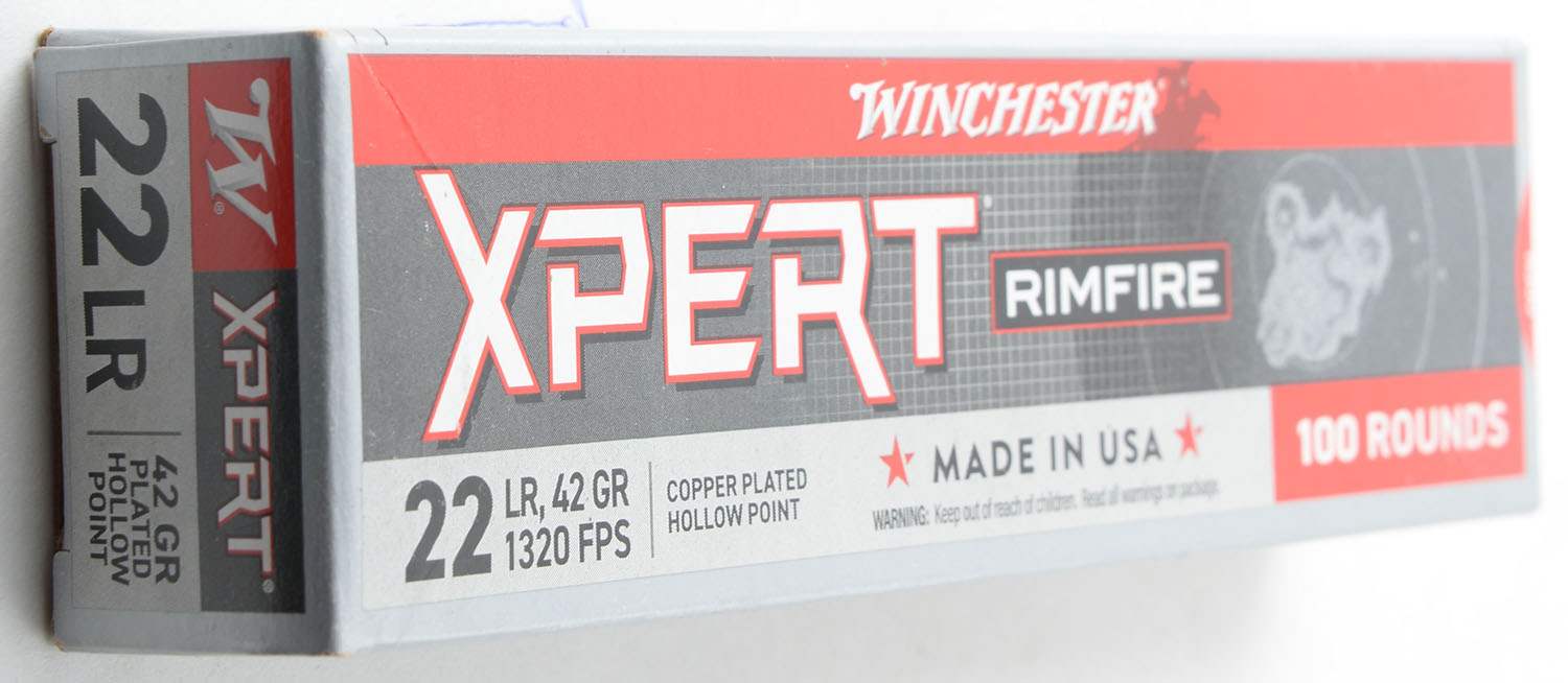 Winchester, Xpert, .22 Long Rifle, 42 Grain Copper Plated Hollow Point, 1320 FPS, Full, 100rds., 1pc. Gray red & white box, box is MINT with minty color, corners are sharp, edges are crisp, end flaps are solid, ammo is mint. Grade: MINT - Value: 10 to 15