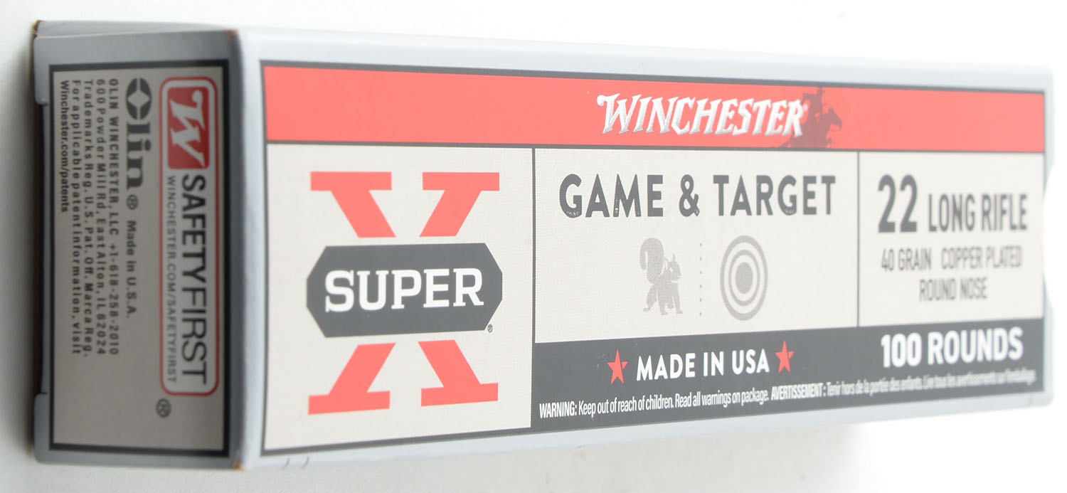 Winchester, Game & Target, .22 Long Rifle, 40 Grain Copper Plated Round Nose, Full, 1pc. Gray red & black box, box is MINT with minty color, corners are sharp, edges are crisp, end flaps are solid, ammo is minty. Grade: MINT - Value: 20 to 30