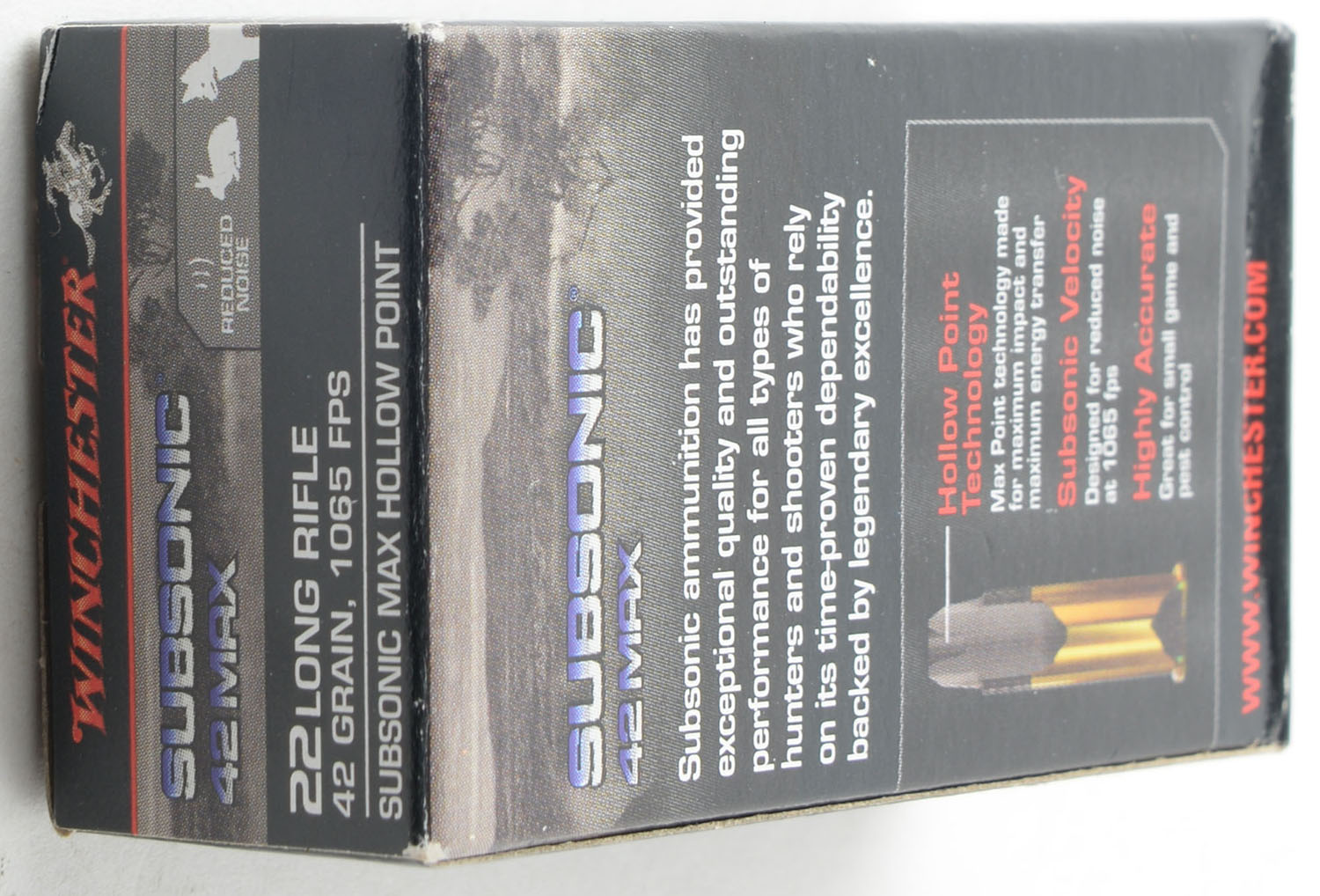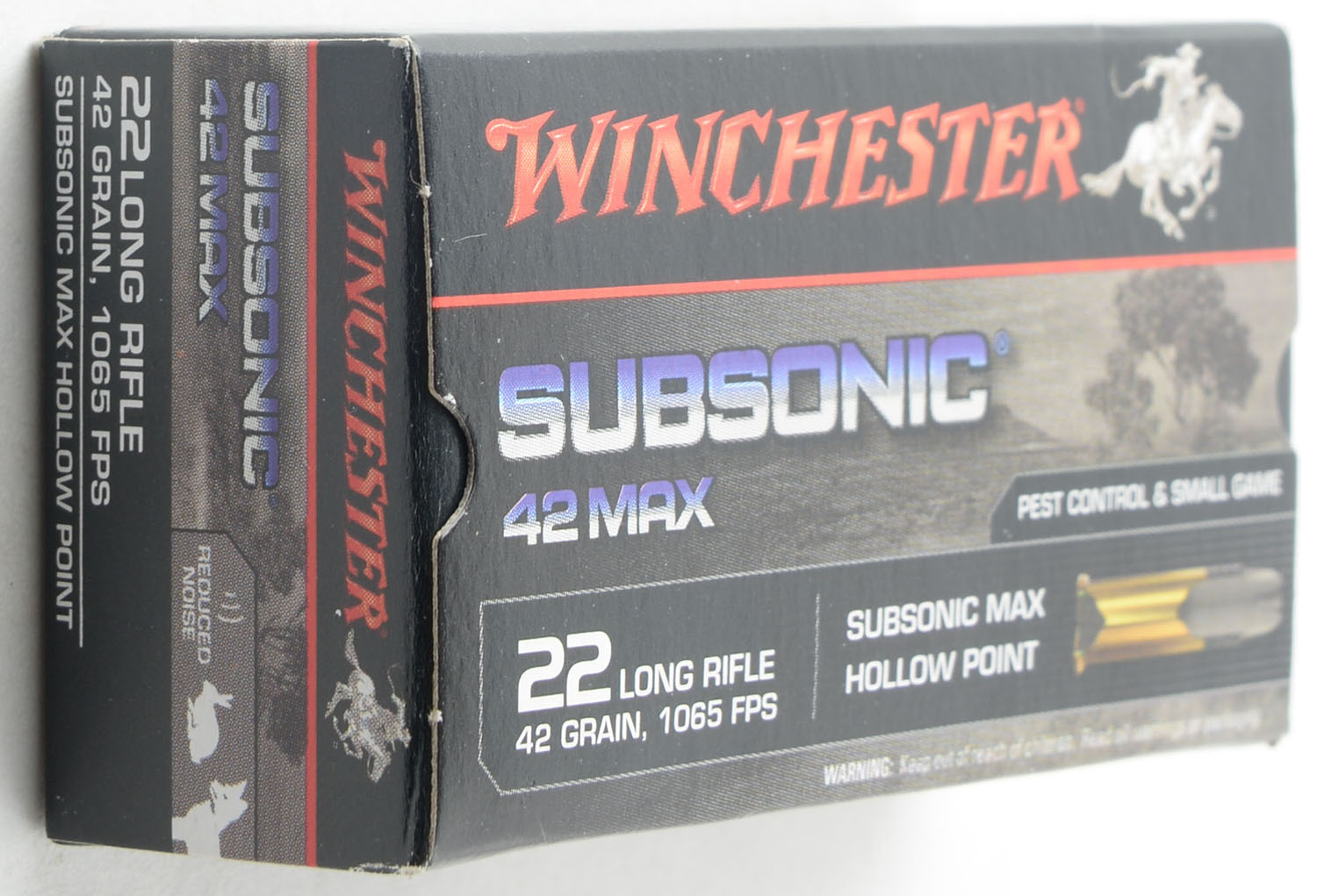 Winchester, Subsonic Max, .22 Long Rifle, 42 Grain Hollow Point, 1065 FPS, Full, 1pc. Black gray & red box, box is MINT with minty color, corners are sharp, edges are crisp, end flaps are solid, ammo is mint. Grade: MINT - Value: 16 to 24