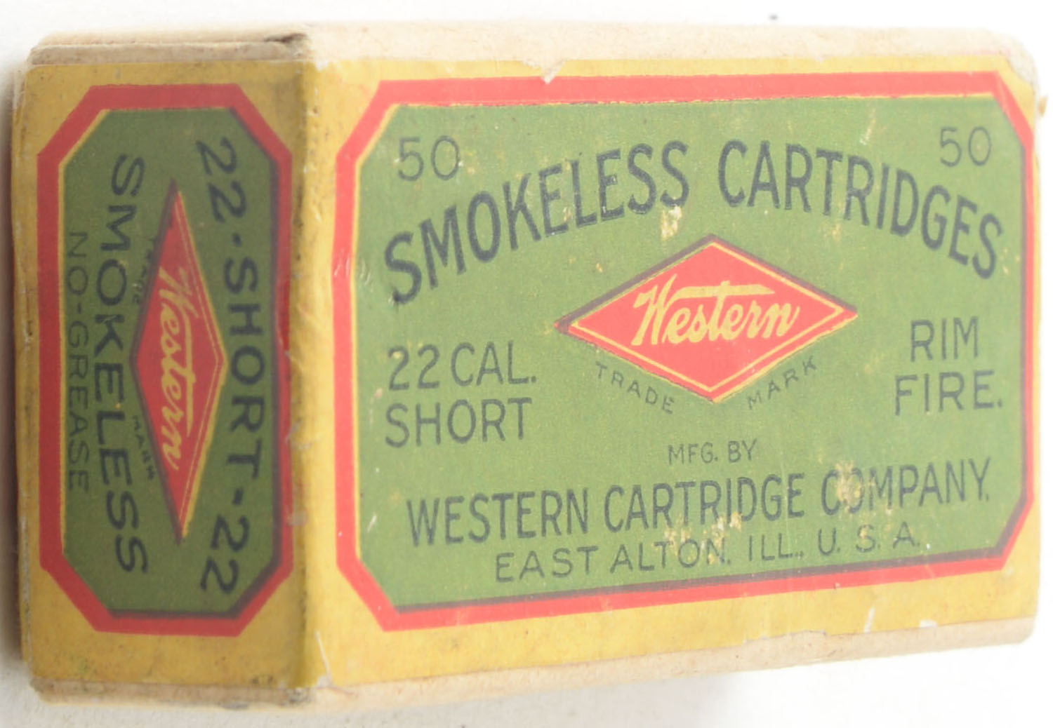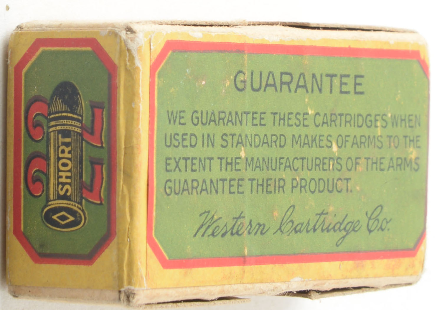 Western, Smokeless Cartridges, .22 Short, No-Grease, RHWeb: WCC-3 S-8.1, FULL & SEALED, 2pc. Buff box with green yellow & red wraparound label, box is solid with excellent color, very minor shelf & corner wear, edges are crisp, label is intact. Grade: Excellent + - Value: 80 to 120