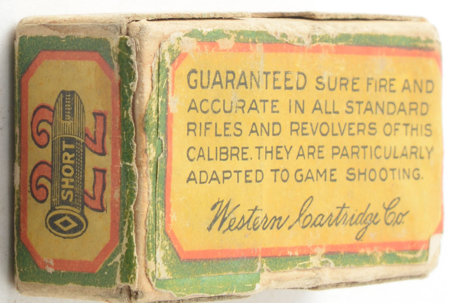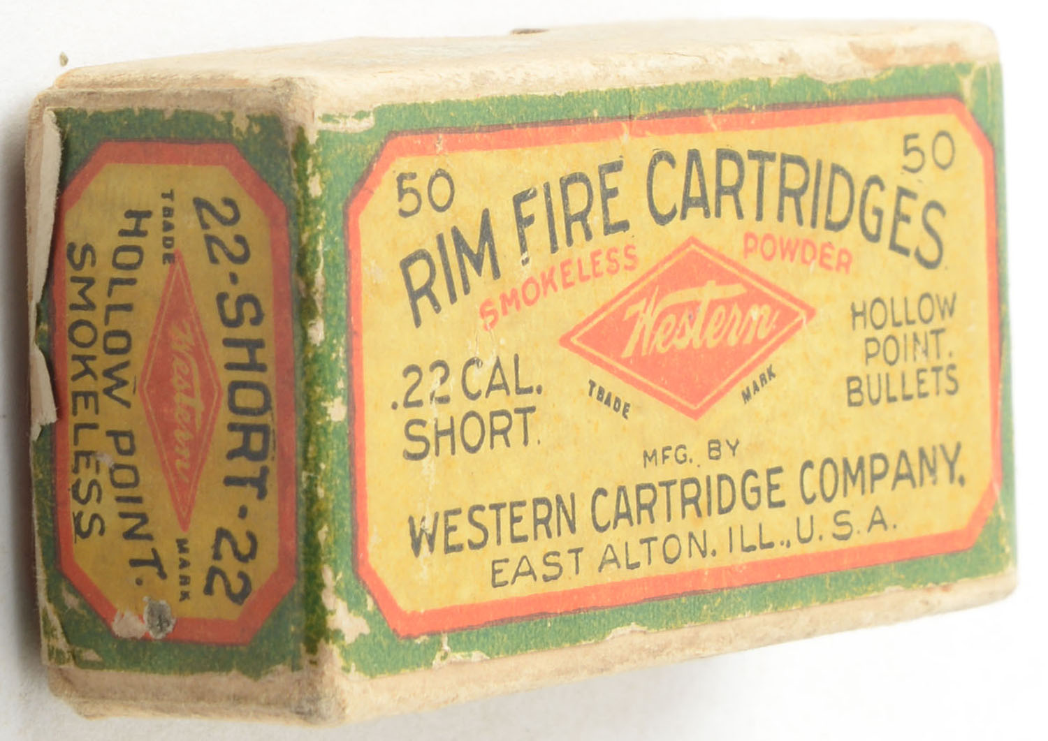 Western, Rim Fire Cartridges, .22 Short Hollow Point, RHWeb: WCC-3 S-7, Full, 2pc. Buff box with yellow green & red wraparound label, box is solid with very good color, some age soiling & shelf wear, minor edge & corner wear, label is intact, ammo is good to very good. Grade: Very Good + - Value: 180 to 270