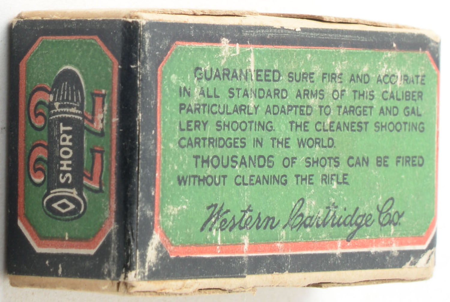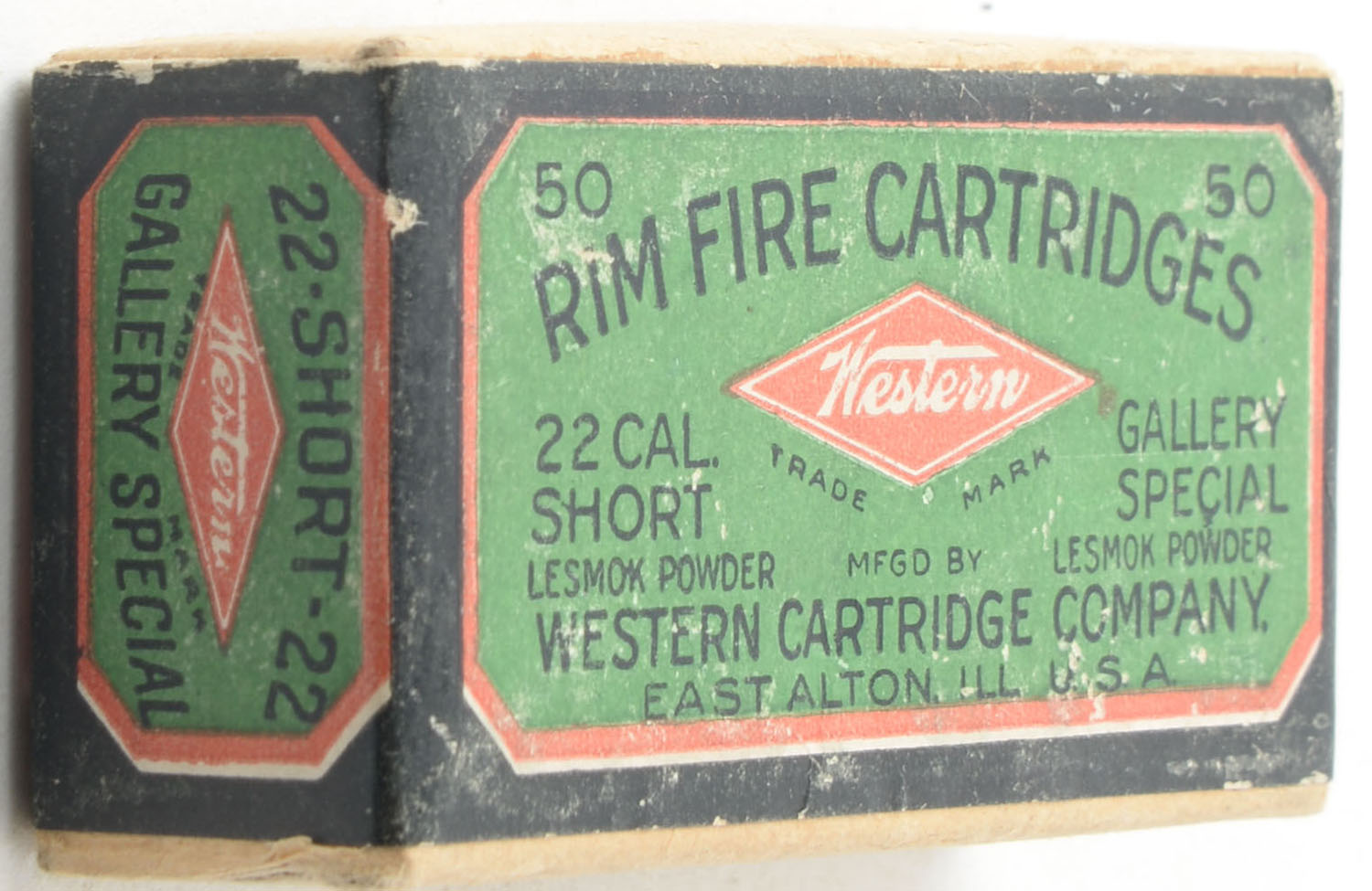Western, Gallery Special, .22 Short, Lesmok Powder, RHWeb: WCC-48 S-5, FULL & SEALED, 2pc. Buff box with green blue & red wraparound label, box is solid with excellent color, some shelf wear, very minor corner wear, edges are mostly crisp, label is intact. Grade: Very Good ++ - Value: 120 to 180