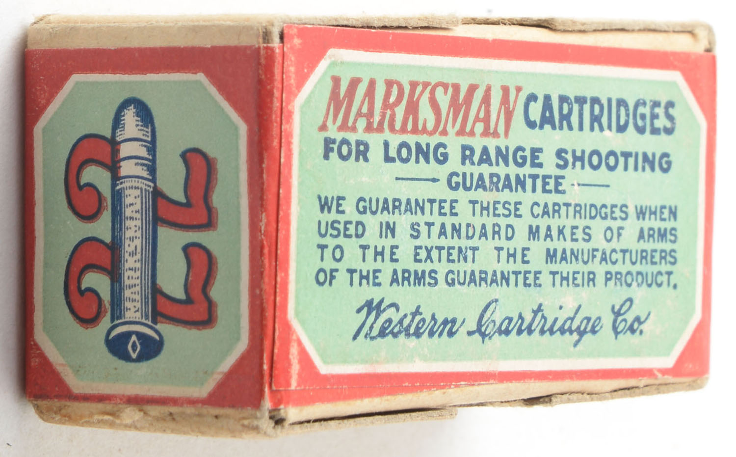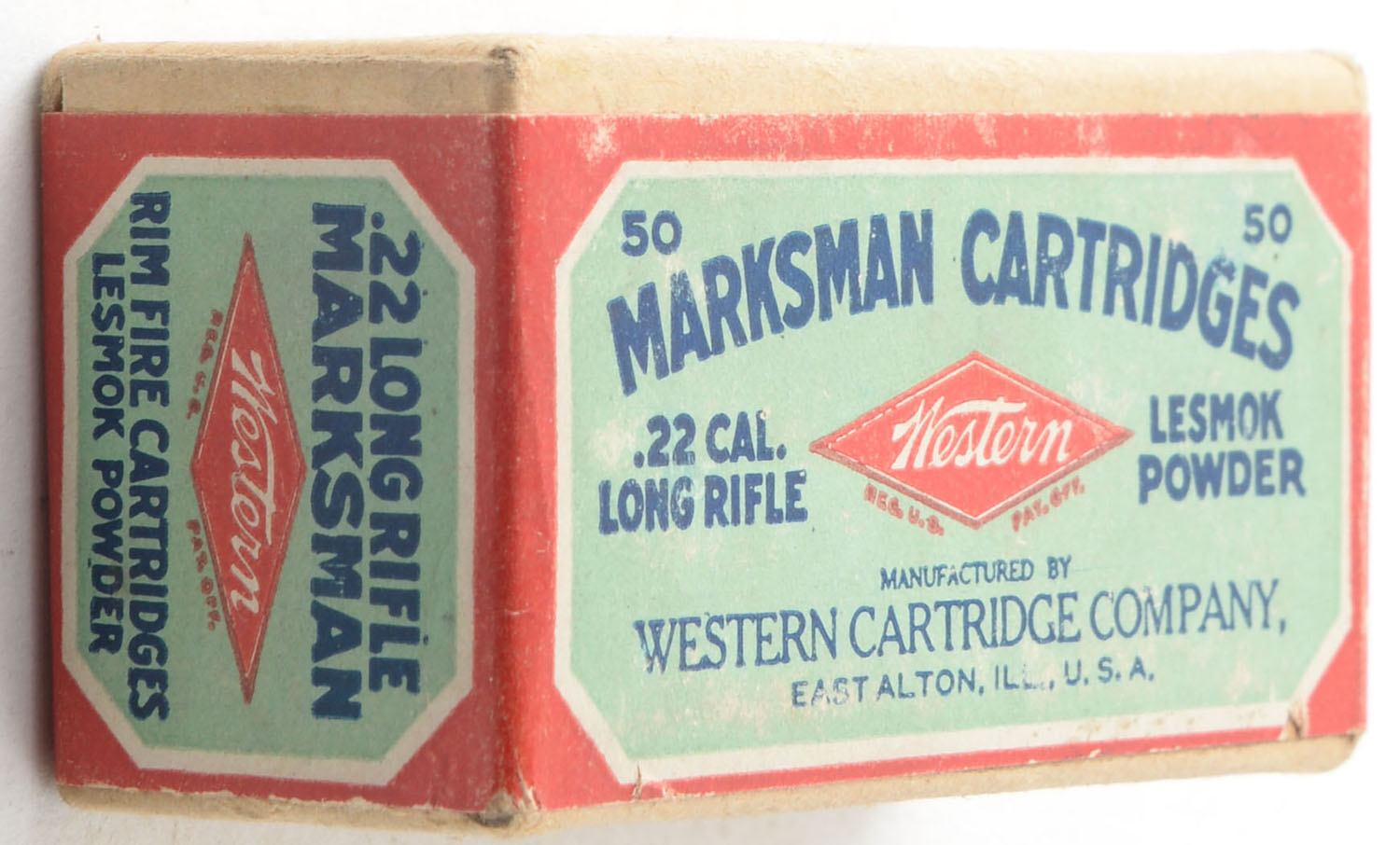 Western, Marksman Cartridges, .22 Long Rifle, Lesmok Powder, RHWeb: WCC-50 LR-3, FULL & SEALED, 2pc. Buff box with green red & blue wraparound label, box is solid with excellent color, minor shelf & corner wear, edges are mostly crisp, label is intact. Grade: Excellent + - Value: 100 to 150