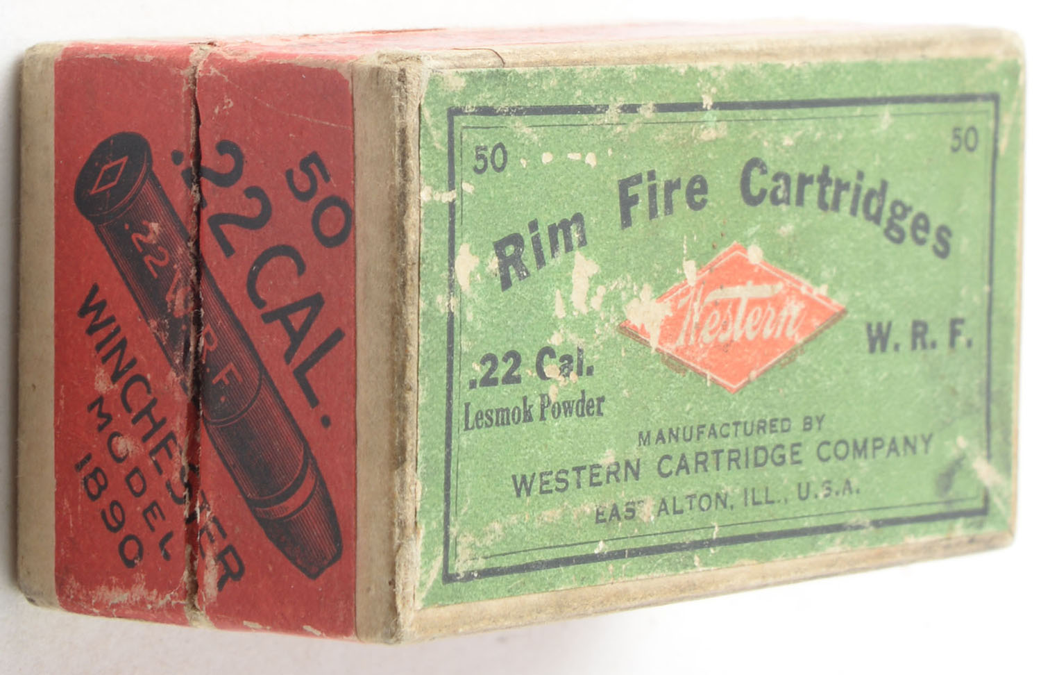 Western, Rim Fire Cartridges, .22 W.R.F., Lesmok Powder, Full, 2pc. Buff box with green top & red side sealing labels, box is solid with very good to excellent color, shelf wear, minor corner wear, very minor edge wear, labels are intact, ammo is very good to excellent. Grade: Very Good - Value: 50 to 75