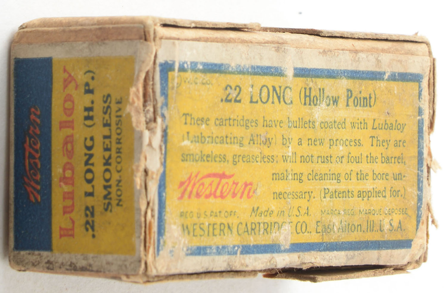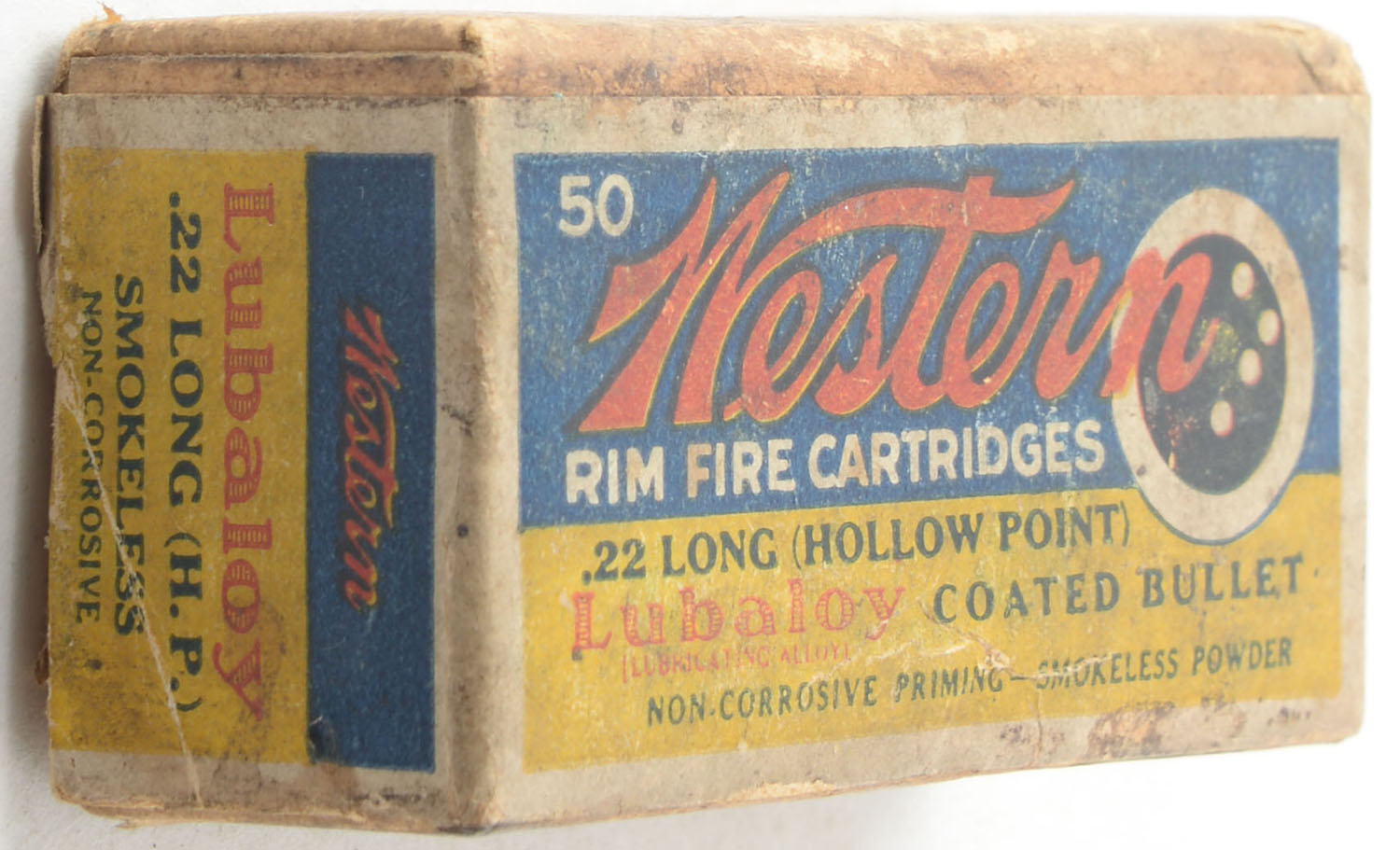 Western, Rim Fire Cartridges, .22 Long Hollow Point, Lubaloy Coated Bullet, RHWeb: WCC-4.2 L-2, Full, 2pc. Buff box with blue yellow & red wraparound bulls eye label, box is solid with good color, age soiling, very minor edge & corner wear, label is intact, ammo is minty. Grade: Very Good - Value: 100 to 150