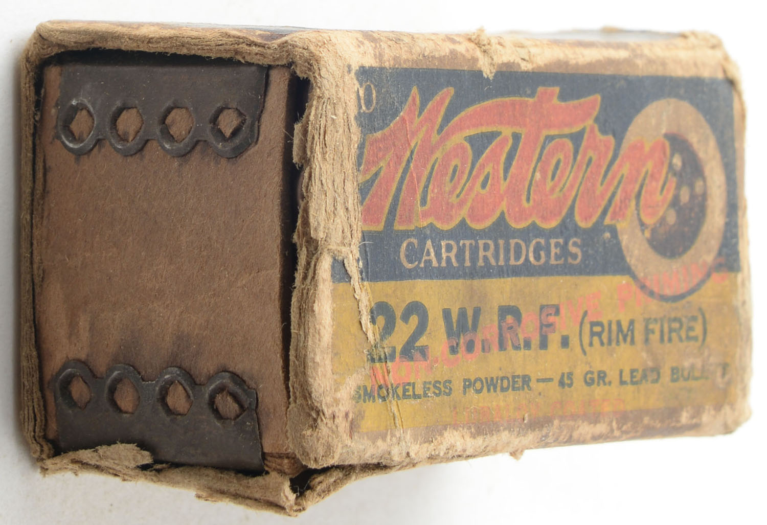 Western, GHOST BOX, .22 W.R.F., Smokeless Powder, Non-Corrosive Priming, RHWeb: WCC-4.3A WRF-2, Partial 47rds. 1pc. Blue yellow & red ghost box with ''Non-Corrosive'' over-printing, missing both end flaps, fair color, age soiling, partial seam split to top front edge, edge & corner wear, ammo is very good to excellent. Grade: Fair ++ - Value: 50 to 75