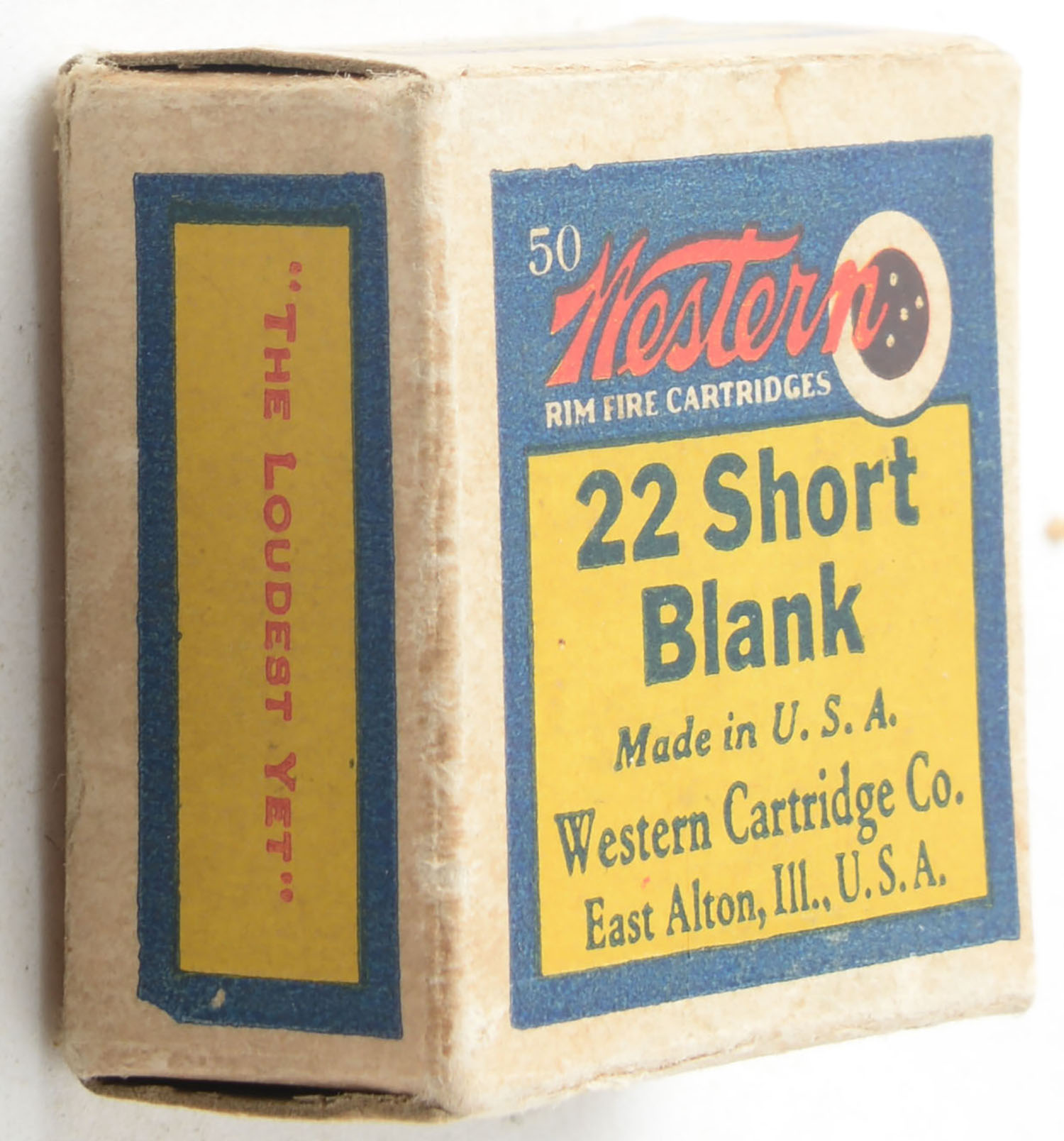 Western, Rim Fire Cartridges, .22 Short Blank, RHWeb: WCC-4.3B S-1c, Partial approx 3/4 full, 1pc. Yellow blue & red printing on a buff box, box is solid with excellent color, very minor age soiling, minor edge & corner wear, top flap is solid, ammo is very good. Grade: Excellent - Value: 10 to 15