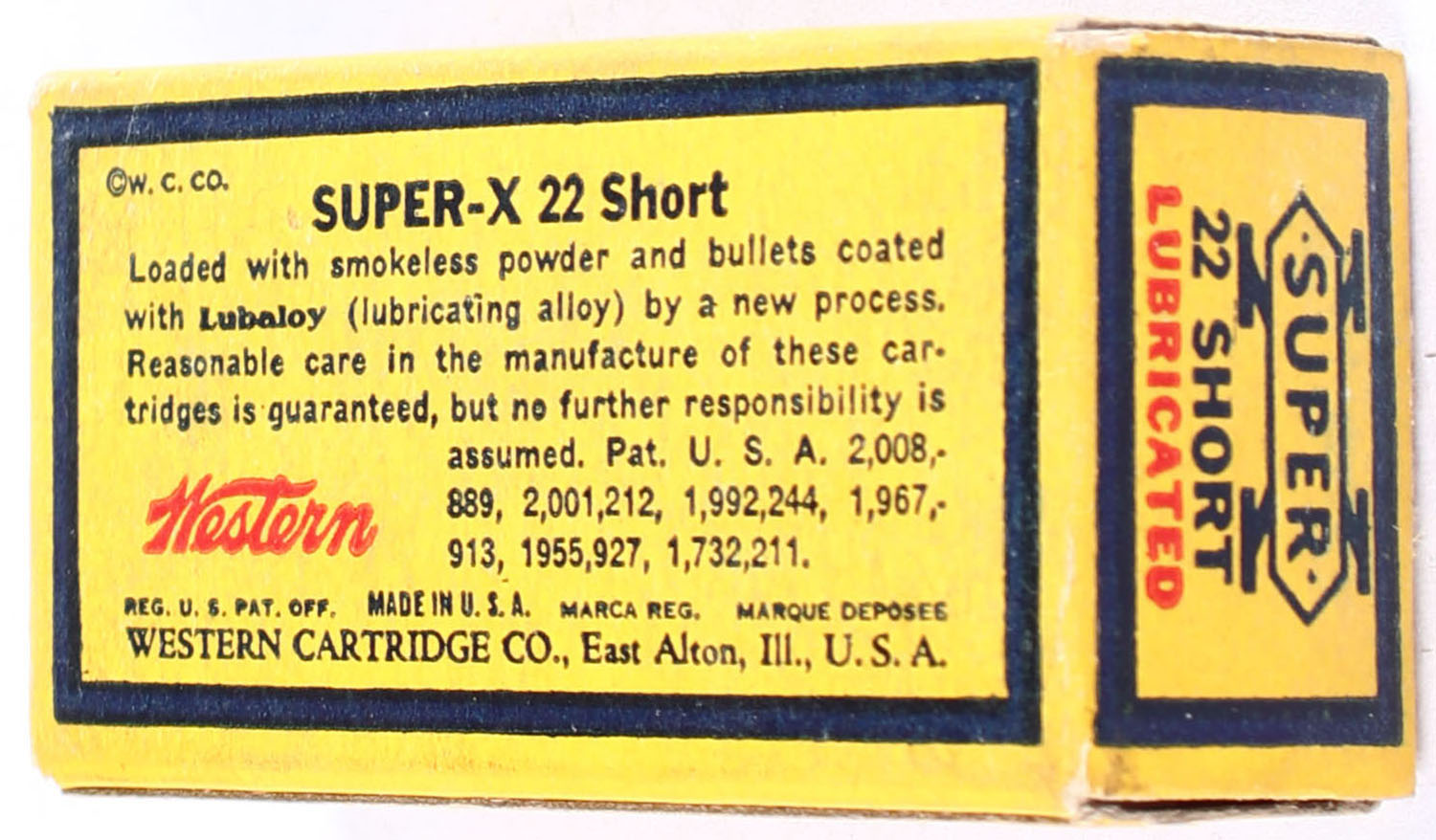 Western, Super-X, .22 Short, Lubricated, RHWeb: Super-X-Shorts-13 S-23, Full, 1pc. Yellow blue & red box, box is solid with excellent color, very minor age soiling & corner wear, edges are mostly crisp, end flaps are solid, ammo is excellent. Grade: Excellent - Value: 20 to 30