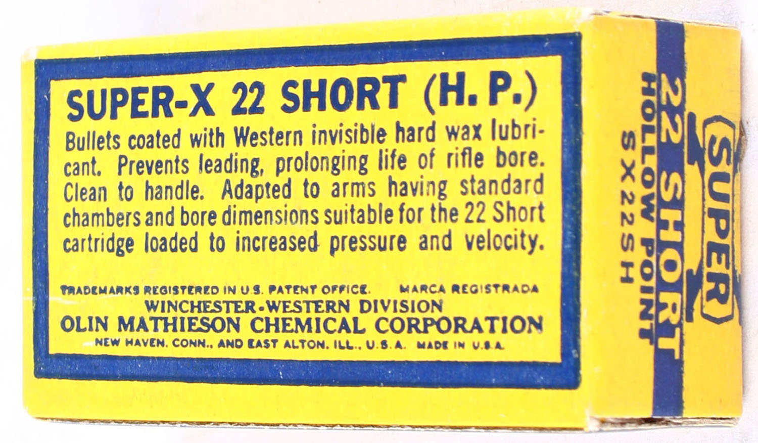 Western, Super-X, .22 Short Hollow Point, Extra Clean Wax Coated, RHWeb: Super-X-Shorts-31 SHP-25, Full, 1pc. Yellow blue & red box, box is MINT with minty color, corners are sharp, edges are crisp, end flaps are solid, ammo is excellent to minty. Grade: MINT - Value: 20 to 30