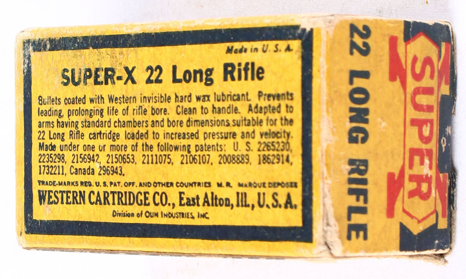 Western, Super-X, .22 Long Rifle, Extra Clean Wax Coated, RHWeb: Super-X-Long Rifle-15 LR-35, Full, 1pc. Yellow blue & red box, box is solid with very good color, some age soiling & corner wear, minor edge wear, end flaps are solid, top has been written on, ammo is very good. Grade: Very Good - Value: 6 to 10