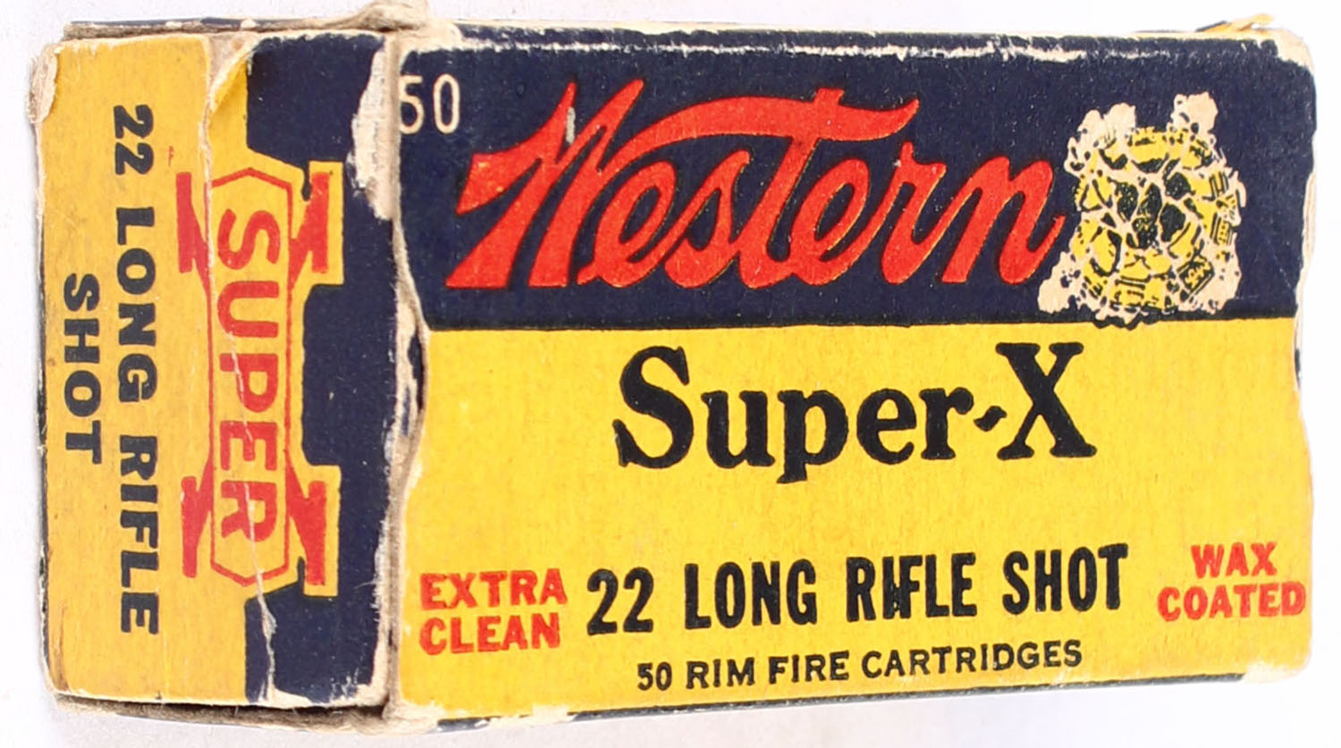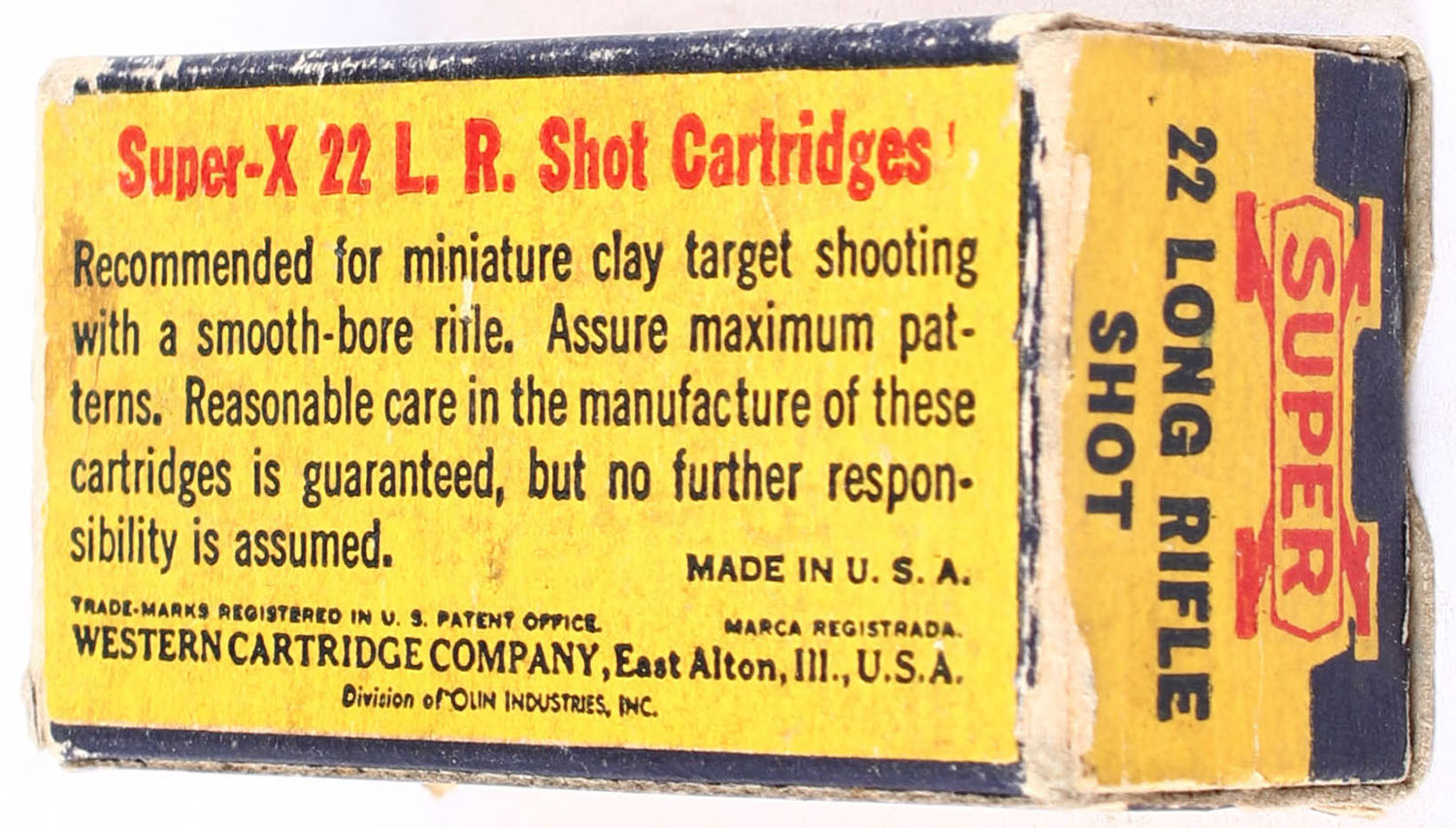 Western, Super-X, .22 Long Rifle Shot, Extra Clean Wax Coated, RHWeb: Super-X-Long Rifle-46 LRS-14, Full of incorrect ammo, 1pc. Yellow blue & red box, box is solid with excellent color, some edge & corner wear, end flaps are solid, ammo is excellent. Grade: Very Good + - Value: 8 to 12