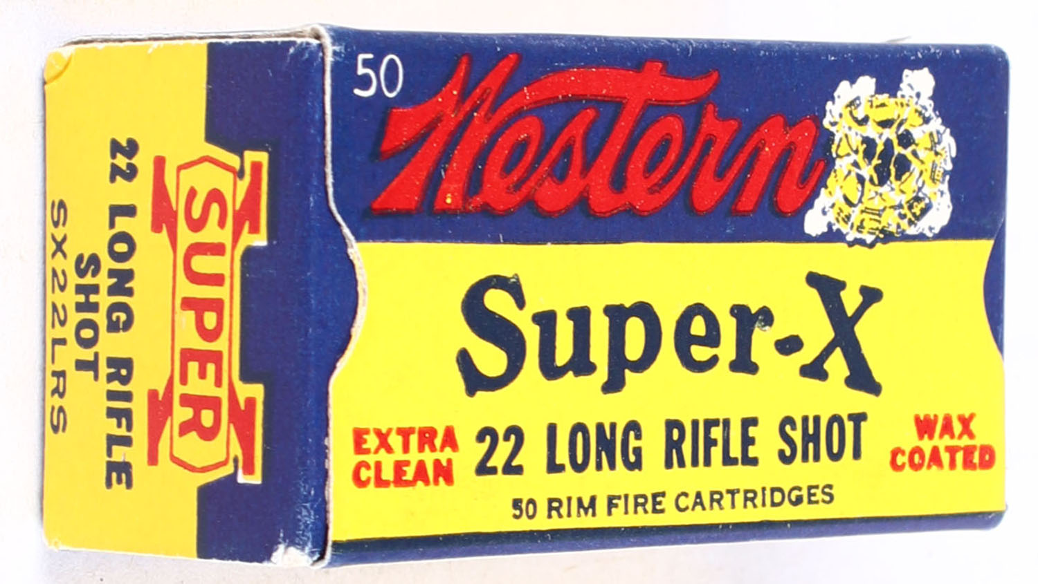 Western, Super-X, .22 Long Rifle Shot, Extra Clean Wax Coated, RHWeb: Super-X-Long Rifle-48 LRS-20, Full, 1pc. Yellow blue & red box, box is MINT with minty color, corners are mostly sharp, edges are crisp, end flaps are solid, ammo is excellent. Grade: MINT - Value: 30 to 45