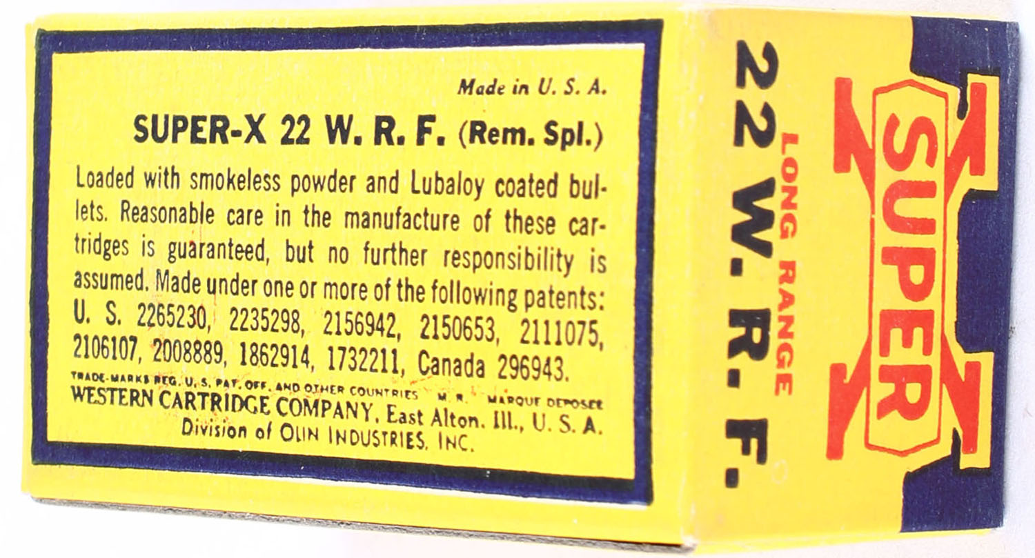 Western, Super-X, .22 W.R.F., Long Range, RHWeb: Super-X-W.R.F-9 WRF-13, Full, 1pc. Yellow blue & red box, box is MINT with minty color, corners are sharp, edges are crisp, end flaps are solid ammo is very good to excellent. Grade: MINT - Value: 30 to 45