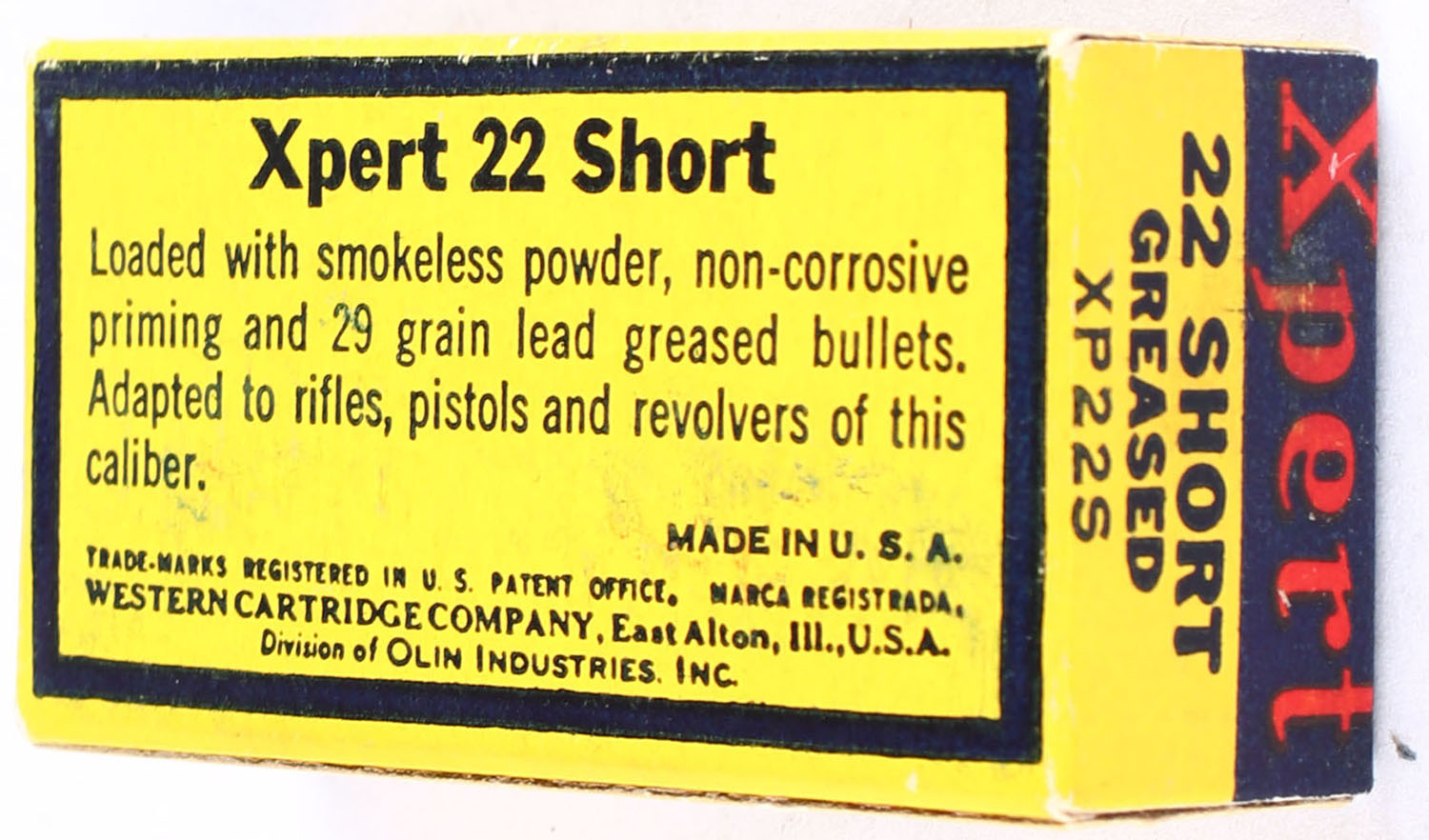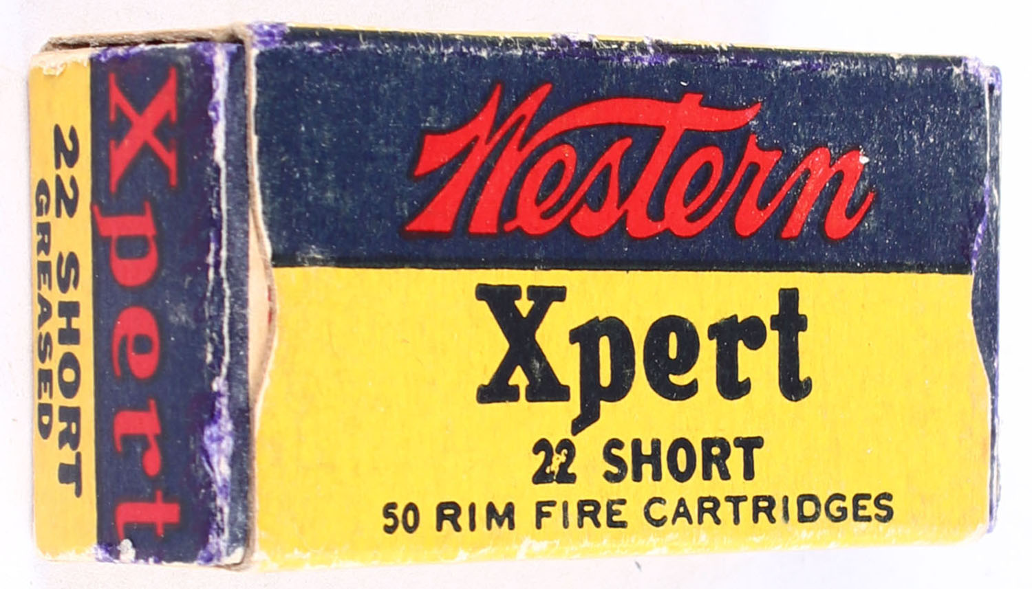 Western, Xpert, .22 Short, Greased, RHWeb: WCC-52 S-1f, Full, 1pc. Yellow blue & red box, box is solid with excellent to minty color, very minor shelf wear, corners are mostly sharp, edges are crisp, end flaps are solid, ammo is very good. Grade: Excellent ++ - Value: 12 to 18