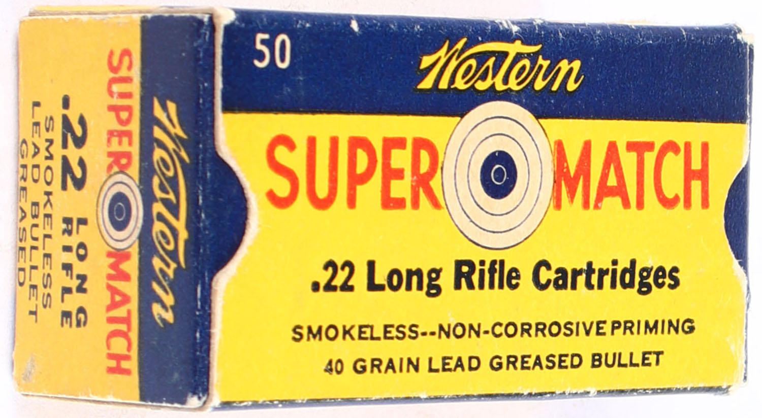 Western, Super Match, .22 Long Rifle, Greased, RHWeb: WCC-51.1 LR-4c, Full, 1pc. Yellow blue & red box, box is solid with excellent color, very minor corner wear, edges are mostly crisp, end flaps are solid, ammo is very good to excellent. Grade: Excellent - Value: 30 to 45