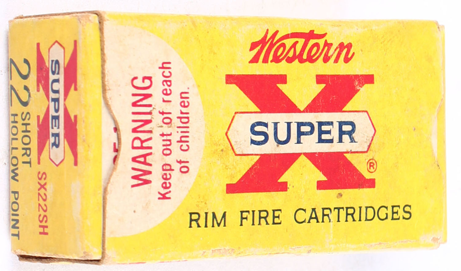 Western, Super X, .22 Short Hollow Point, 27 Gr. Lubaloy Coated Bullet, RHWeb: WCC-12 S-3a, Full, 1pc. Yellow white & red box, box is solid with very good color, some age soiling, minor edge & corner wear, end flaps are solid, ammo is excellent. Grade: Very Good + - Value: 6 to 10