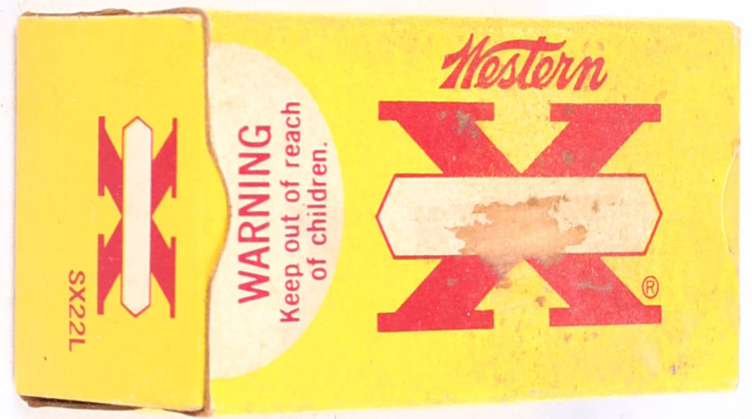 Western, Super X, .22 Long, RHWeb: WCC-12 L-1.1, Full, 1pc. Yellow white & red box, Rare printing error, box is solid with very good color, some age soiling & staining, some shelf wear, very minor corner wear, edges are mostly crisp, end flaps are solid, ammo is excellent, this box appears to be the example in RHWeb. Grade: Very Good - Value: 100 to 150