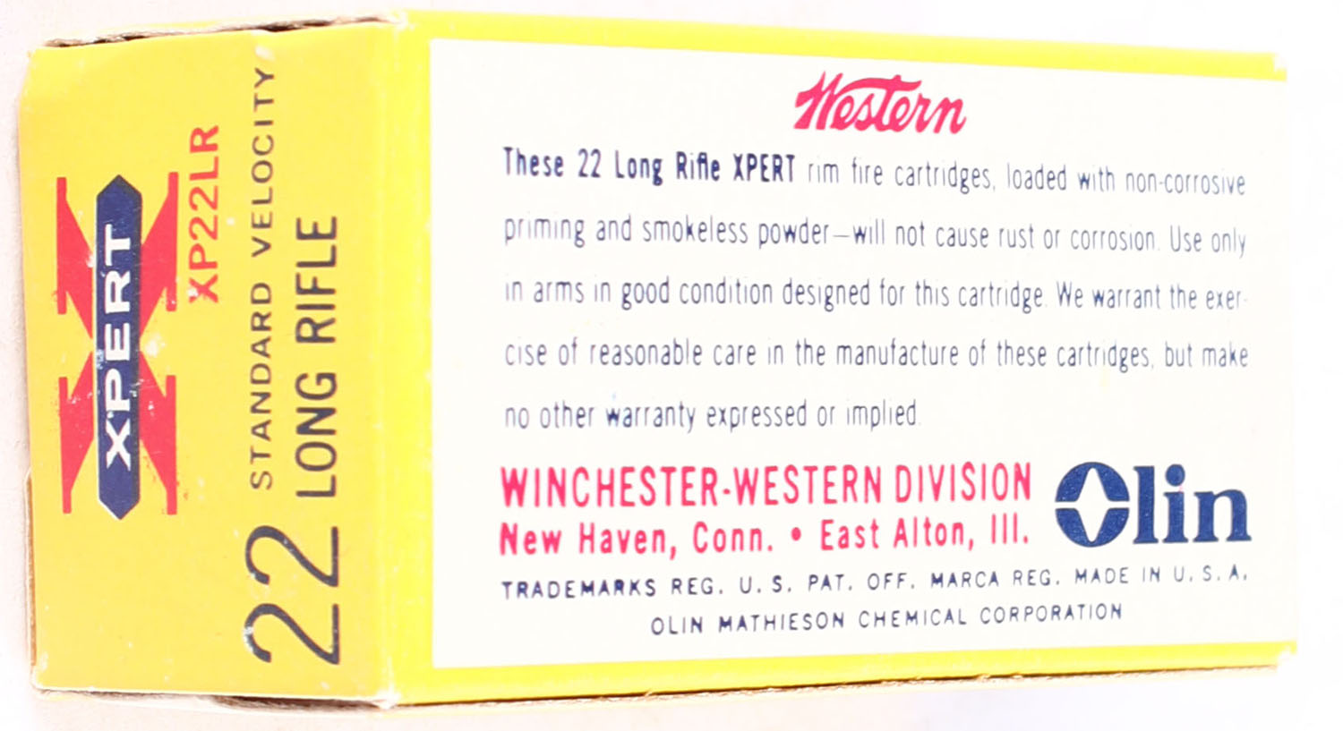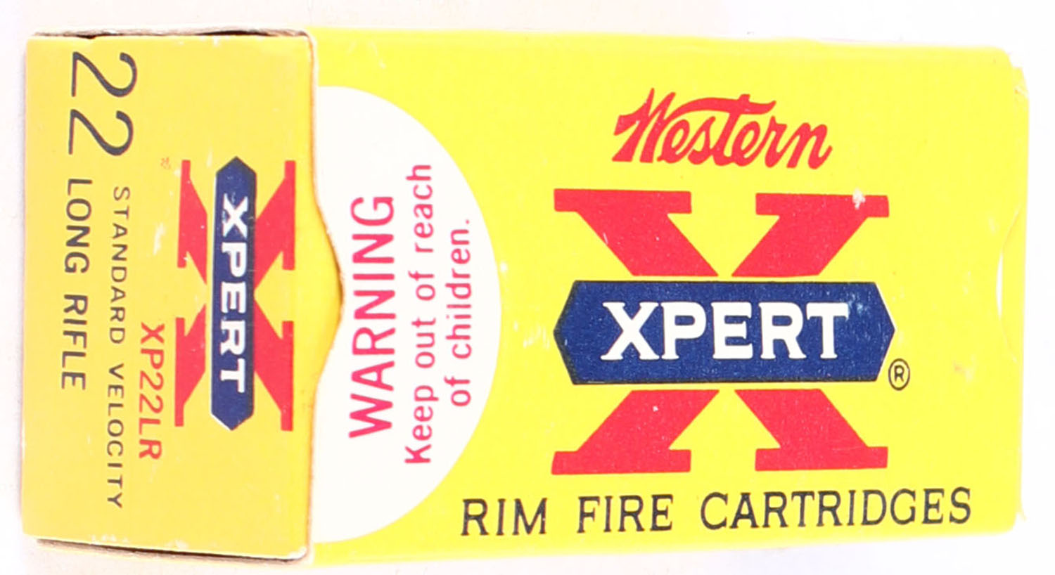 Western, Xpert, .22 Long Rifle, Standard Velocity, RHWeb: WCC-52 LR-3a, Full, 1pc. Yellow white & red box, box is MINT with minty color, corners are sharp, edges are crisp, end flaps are solid, ammo is minty. Grade: MINT - Value: 6 to 10