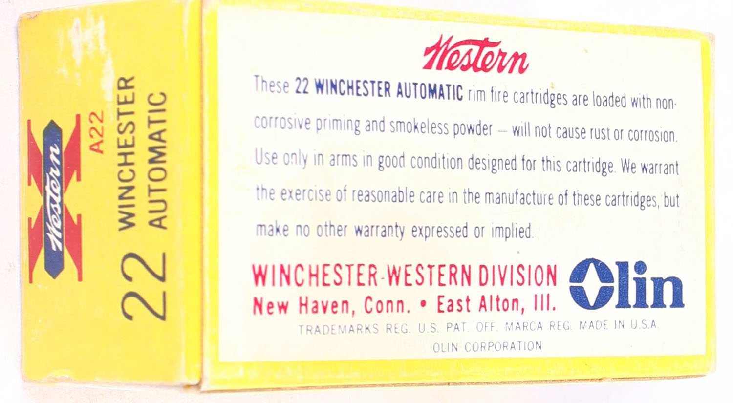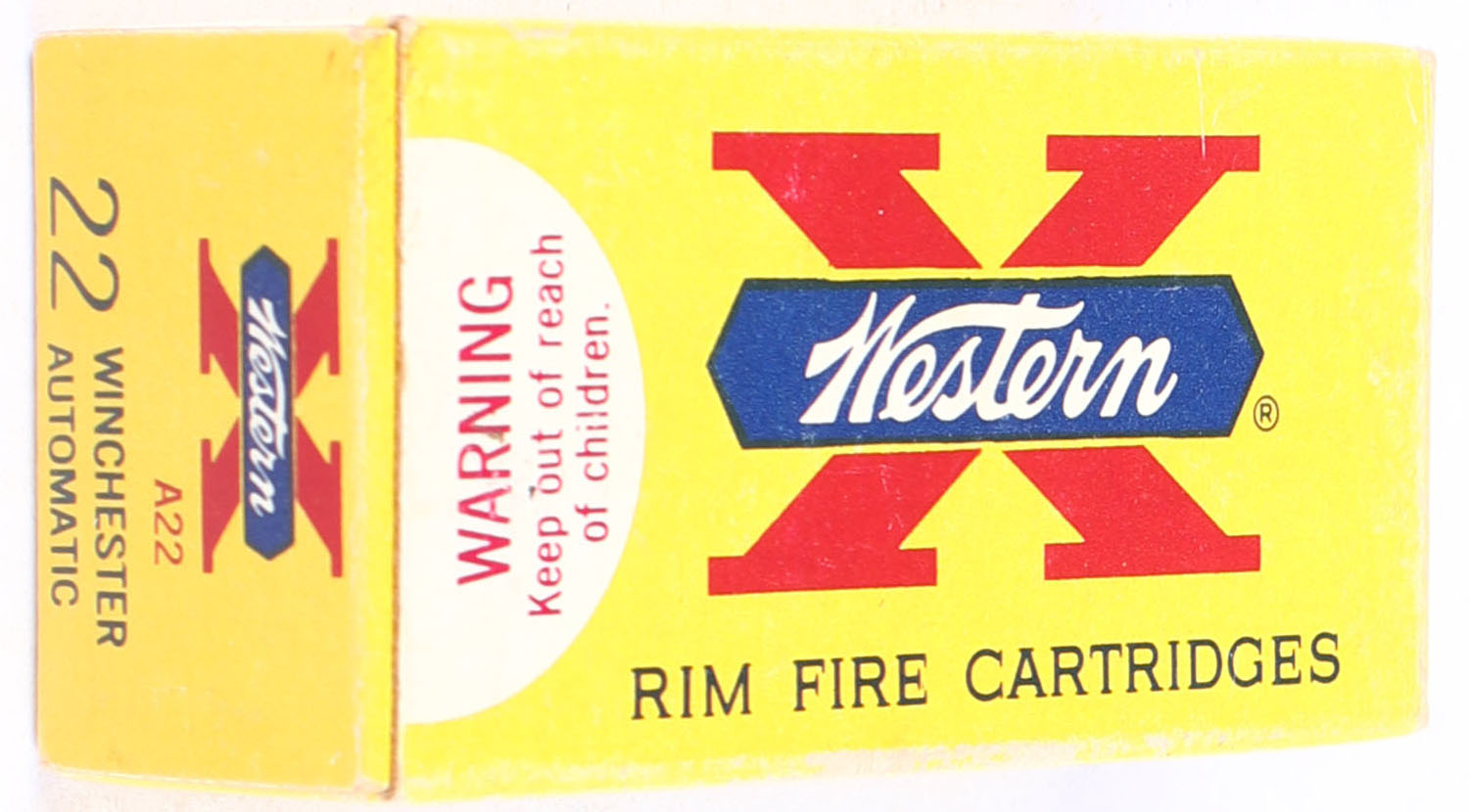 Western, X, .22 Winchester Automatic, 45 Gr. Lubaloy Coated Bullet, RHWeb: WCC-12 WA-1a, Full, 1pc. Yellow white & red box, box is solid with excellent color, very minor edge & corner wear, end flaps are solid, ammo is minty. Grade: Excellent - Value: 2 to 30