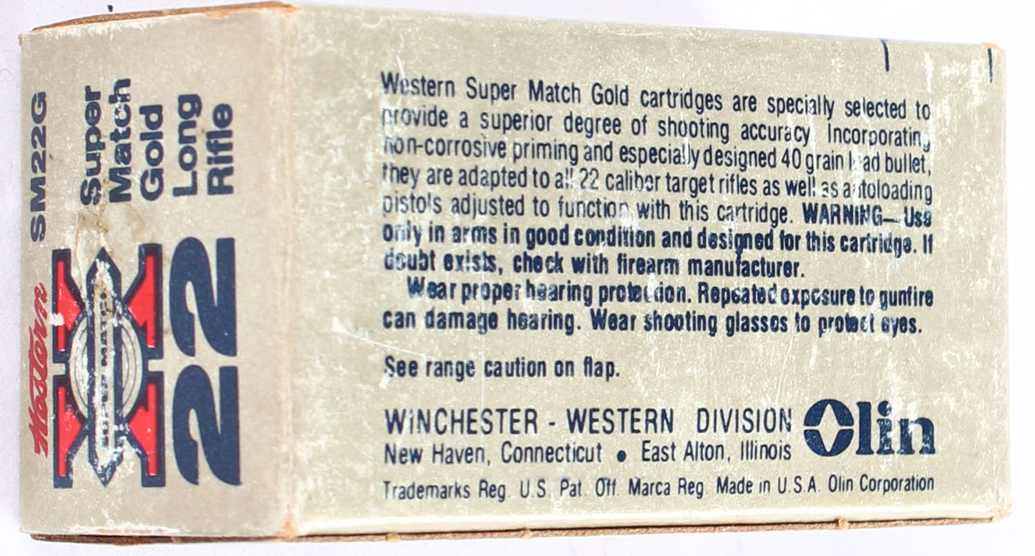 Western, Super Match Gold, .22 Long Rifle, Special Match Bullet, RHWeb: WCC-51.5 LR-2, Full, 1pc. Gold red & black box, box is solid with very good color, minor color fading, some shelf wear, very minor edge & corner wear, end flaps are solid, ammo is excellent. Grade: Very Good - Value: 40 to 60