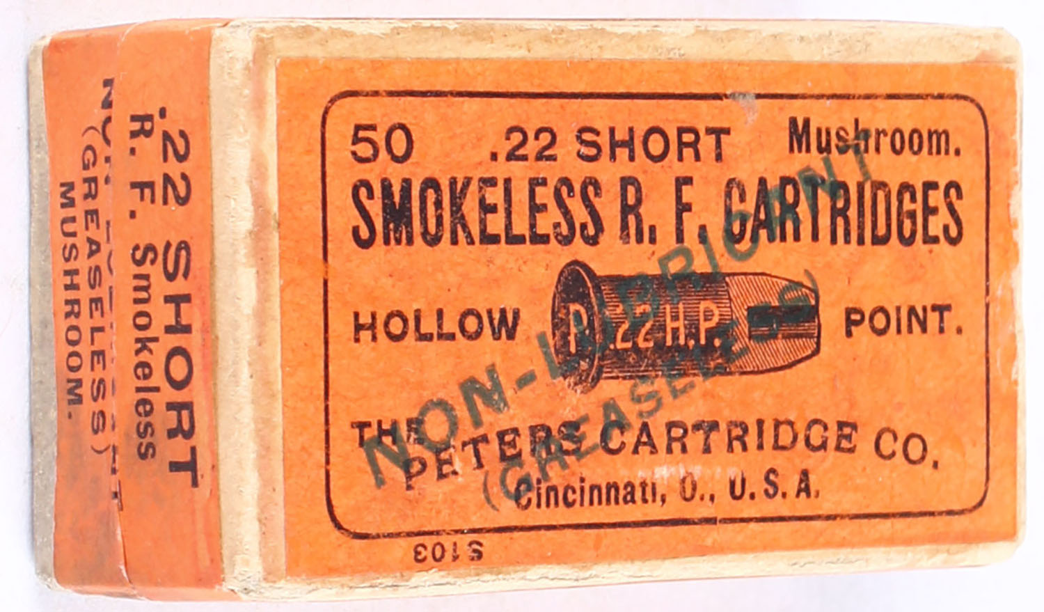 Peters, Smokeless R.F. Cartridges, .22 Short Hollow Point, Non-Lubricant (Greaseless), RHWeb: PCC-2 S-7, FULL & SEALED, 2pc. Buff box with orange top & side sealing labels, green 'Greaseless' over-stamp, box is solid with excellent color, some staining on bottom & right end, minor edge & corner wear, labels are intact. Grade: Excellent - Value: 200 to 300