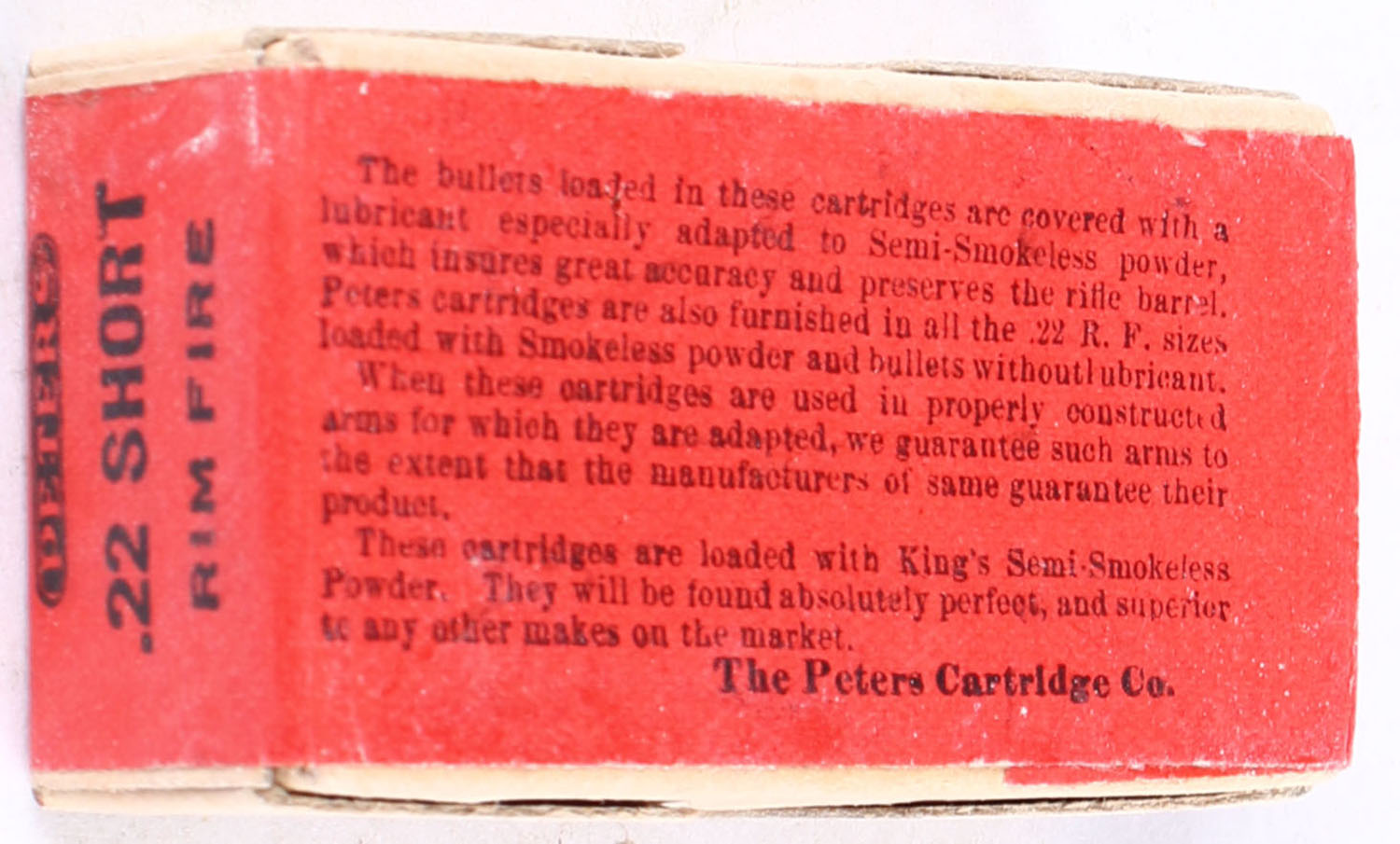 Peters, Rim Fire Rifle Cartridges, .22 Short, Swaged Bullet, RHWeb: PCC-4 S-1b, FULL & SEALED, 2pc. Buff box with red wraparound label, box is solid with excellent to minty color, very minor corner wear, edges are crisp, label is intact. Grade: Excellent ++ - Value: 120 to 180
