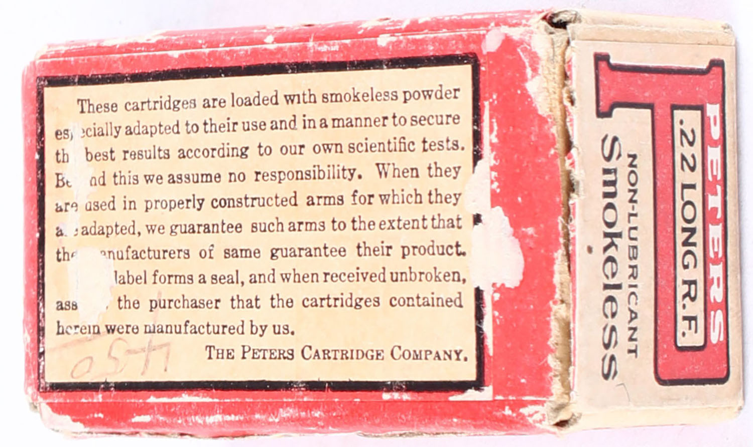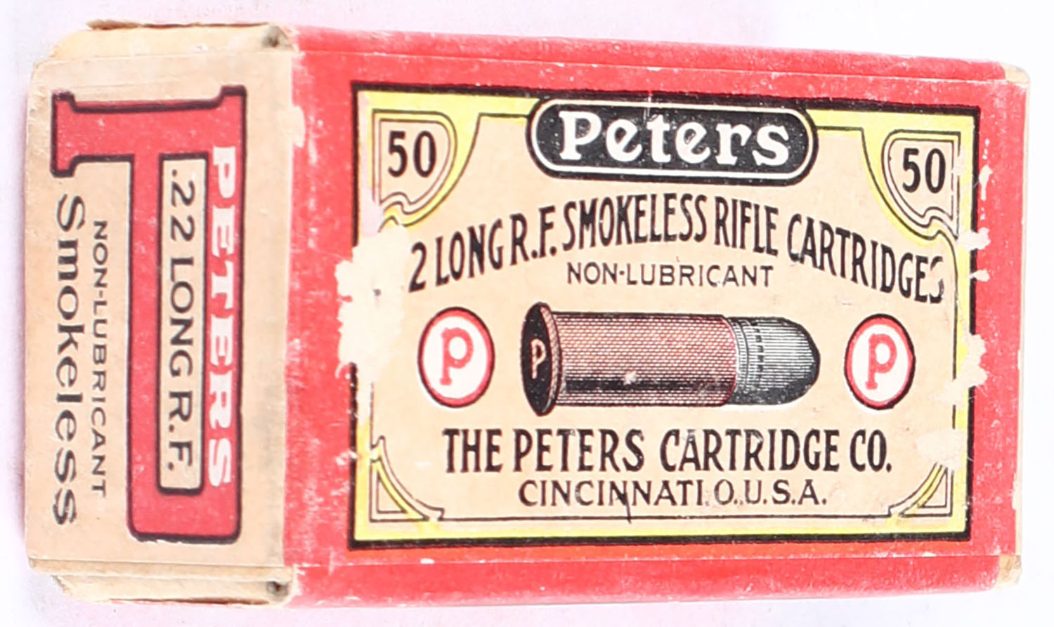 Peters, Smokeless Rifle Cartridges, .22 Long, Non-Lubricant, RHWeb: PCC-5A L-4, FULL & SEALED, 2pc. Buff box with buff red & yellow full wraparound label, box is solid with excellent color, some shelf wear, very minor corner wear, edges are mostly crisp, front & back sides have been written on, label is intact. Grade: Very Good ++ - Value: 60 to 90
