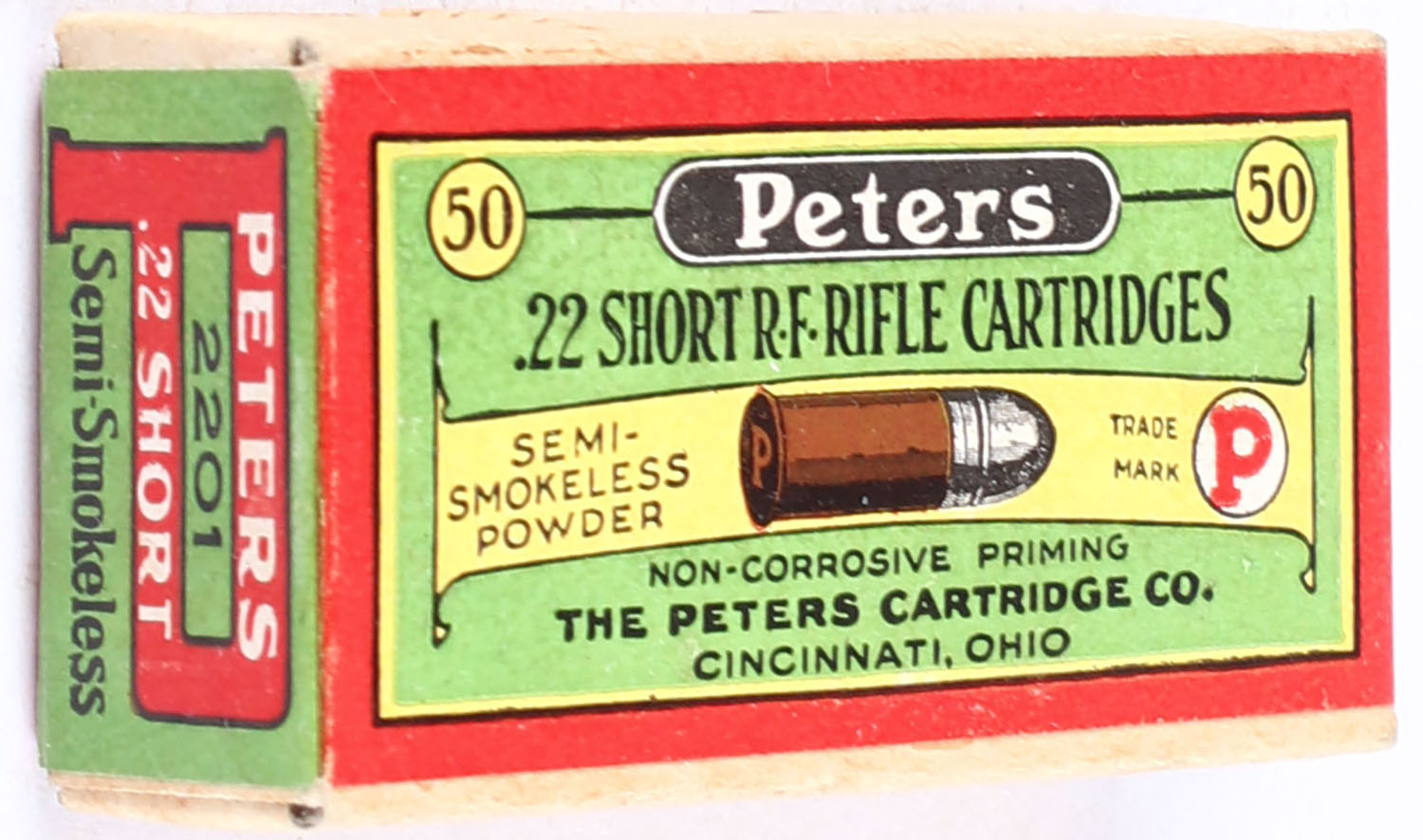 Peters, R.F. Rifle Cartridges, .22 Short, Semi-Smokeless Powder, RHWeb: PCC-5B S-1c, FULL & SEALED, 2pc. Buff box with green red & yellow wraparound label, box is near mint with minty color, only very minor edge & corner wear, label is intact. Grade: Excellent ++ - Value: 70 to 100