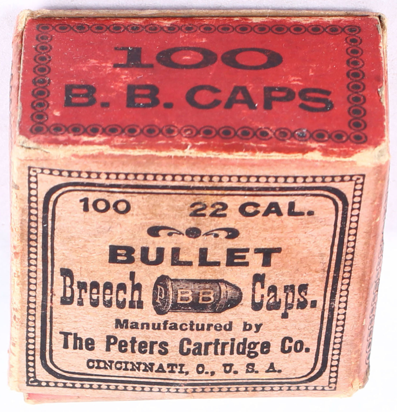 Peters, Bullet Breech Caps, B.B. Caps, RHWeb: PCC-4 BB-1, Full, 1pc. Red box with black printing, box is solid with good color, color fading, some shelf wear, minor edge & corner wear, end flaps are solid, ammo is very good. Grade: Very Good - Value: 100 to 150
