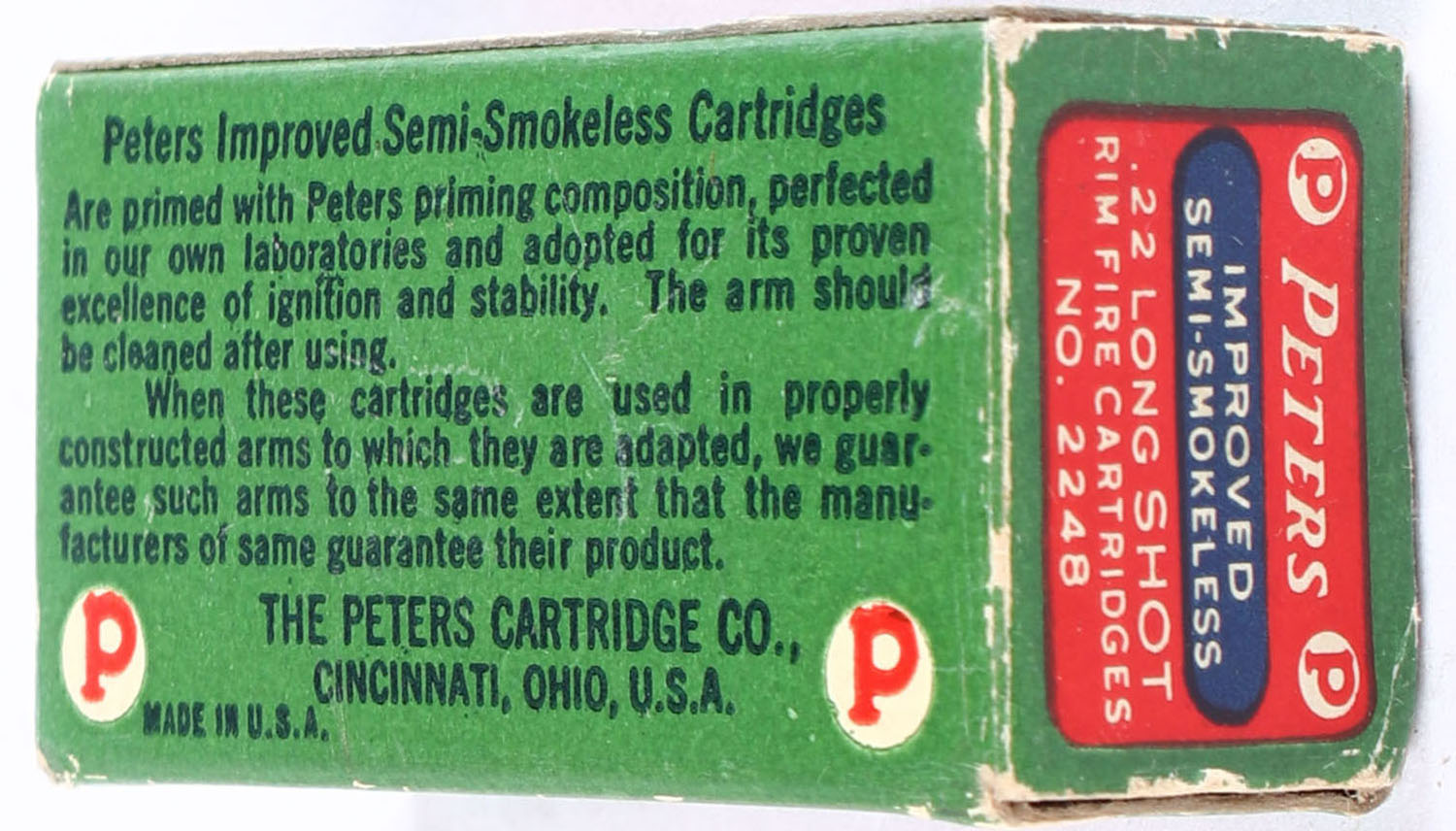 Peters, Improved Semi-Smokeless, .22 Long Shot, RHWeb: PCC-6 L-3, Full, 1pc. Red green & blue box, box is solid with excellent to minty color, minor corner wear, very minor edge wear, end flaps are solid, ammo is excellent. Grade: Excellent ++ - Value: 500 to 750