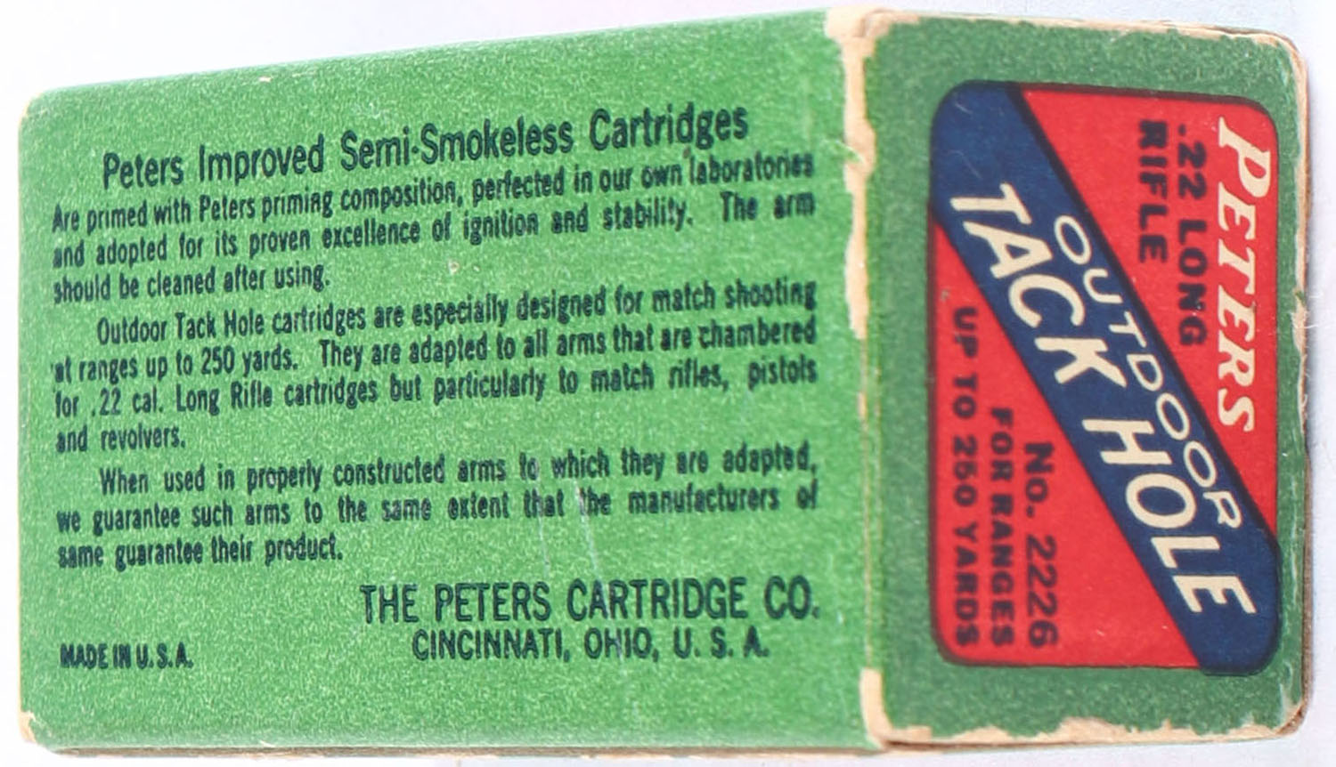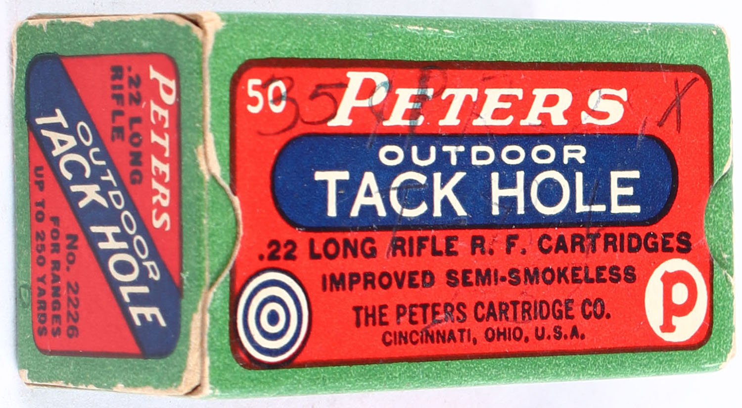Peters, Outdoor Tack Hole, .22 Long Rifle, Improved Semi-Smokeless, RHWeb: PCC-52 LR-9, Full, 1pc. Red green & blue box, box is solid with excellent color, minor corner wear, edges are crisp, top has been written on, end flaps are solid, ammo is very good to excellent. Grade: Very Good + - Value: 80 to 120