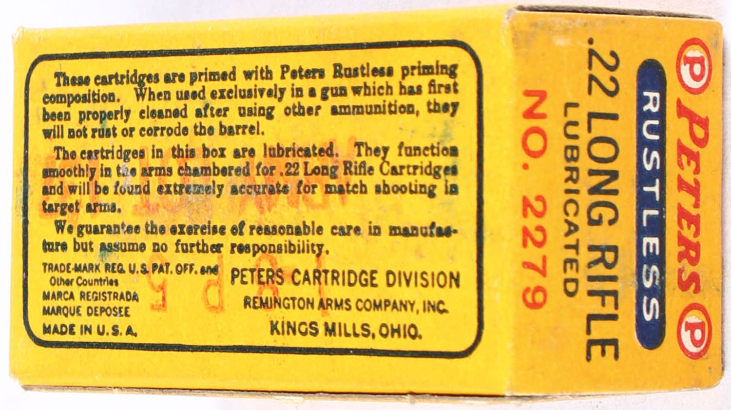 Peters, Rustless, .22 Long Rifle, Lubricated, RHWeb: PCC-8C LR-2, Full, 1pc. Blue yellow & red box, box is solid with excellent color, minor shelf wear, corners are mostly sharp, edges are crisp, end flaps are solid, ammo is excellent. Grade: Excellent - Value: 20 to 30