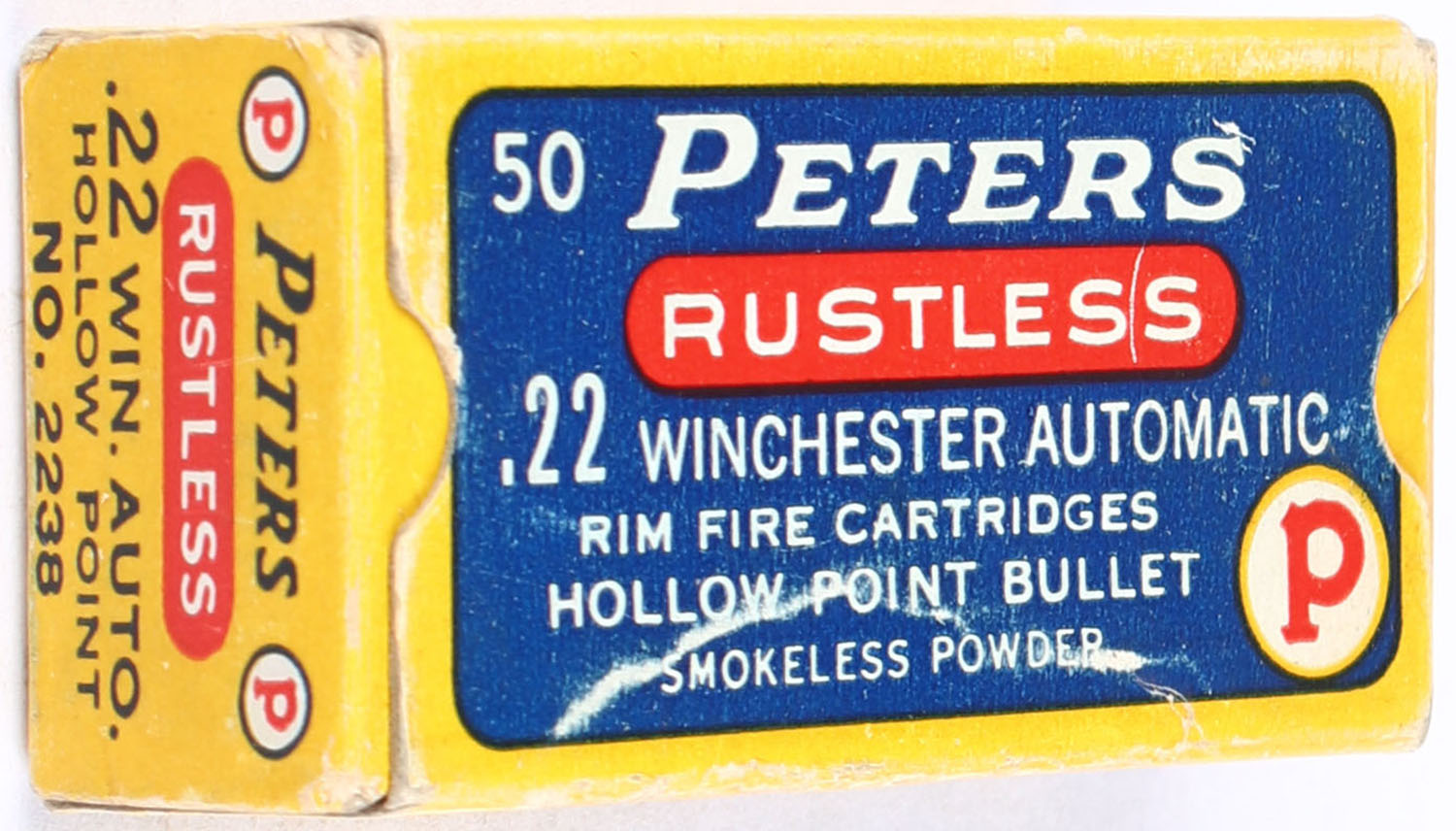 Peters, Rustless, .22 Winchester Automatic Hollow Point, Smokeless, RHWeb: PCC-8C WA-4, Partial 34rds. 1pc. Blue yellow & red box, box is solid with excellent color, crease on top, minor corner wear, very minor edge wear, end flaps are solid, ammo is excellent. Grade: Excellent - Value: 20 to 30