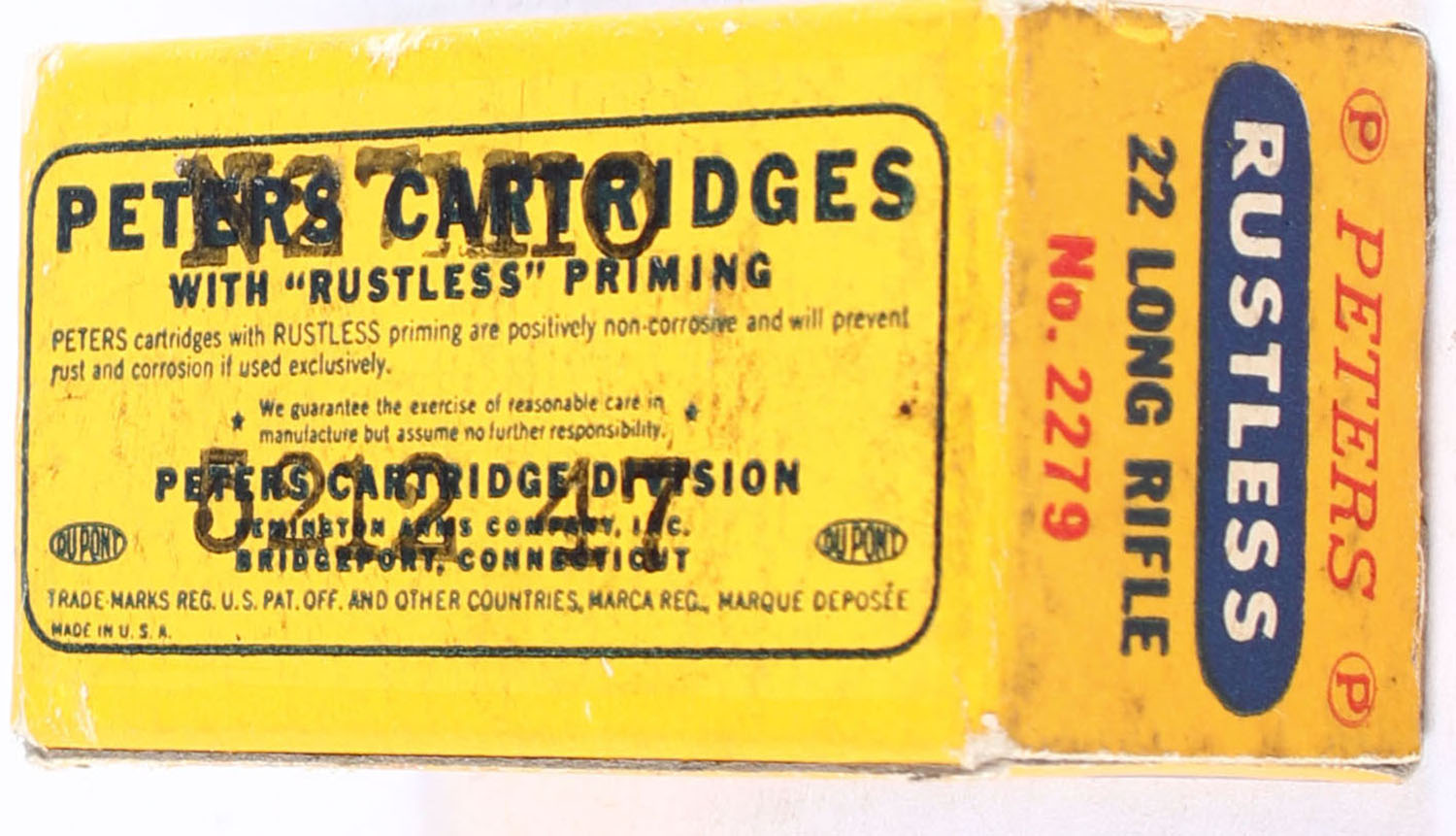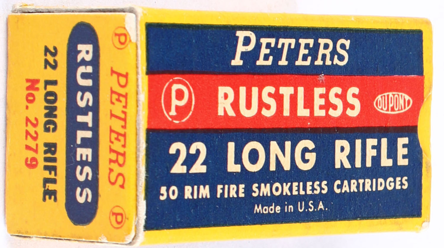 Peters, Rustless, .22 Long Rifle, RHWeb: PCC-8D LR-3g, Full, 1pc. Blue yellow & red box, box is solid with excellent color, very minor corner wear, edges are crisp, end flaps are solid, ammo is excellent. Grade: Excellent + - Value: 20 to 30
