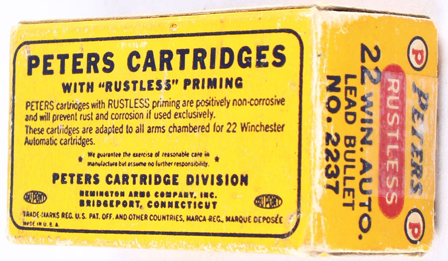 Peters, Rustless, .22 Winchester Automatic, RHWeb: PCC-8D WA-3c, Partial 38rds., 1pc. Blue yellow & red box, box is solid with very good color, tape stain on top, tape on right end some edge & corner wear, end flaps are solid, ammo is mostly excellent, with 3 to 5 rounds that are very corroded. Grade: Good + - Value: 16 to 24