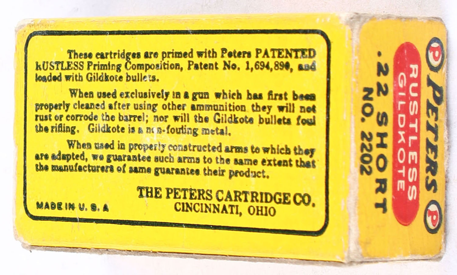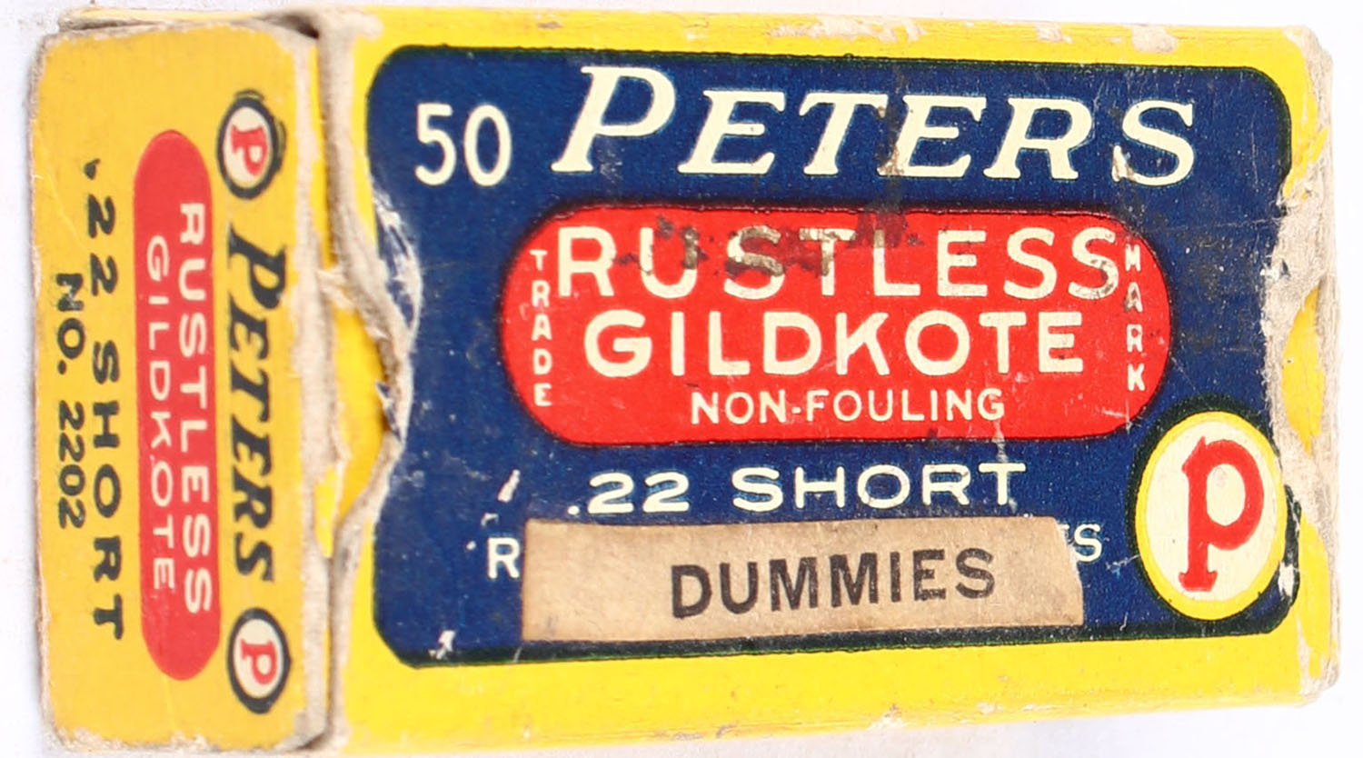 Peters, Rustless Gildkote, .22 Short Dummies, Non-Fouling, RHWeb: PCC-10 S-2, Partial 49rds. 1pc. Blue yellow & red box, box is solid with very good color, some age soiling, some edge & corner wear, end flaps are solid, ammo is minty. Grade: Very Good - Value: 80 to 120