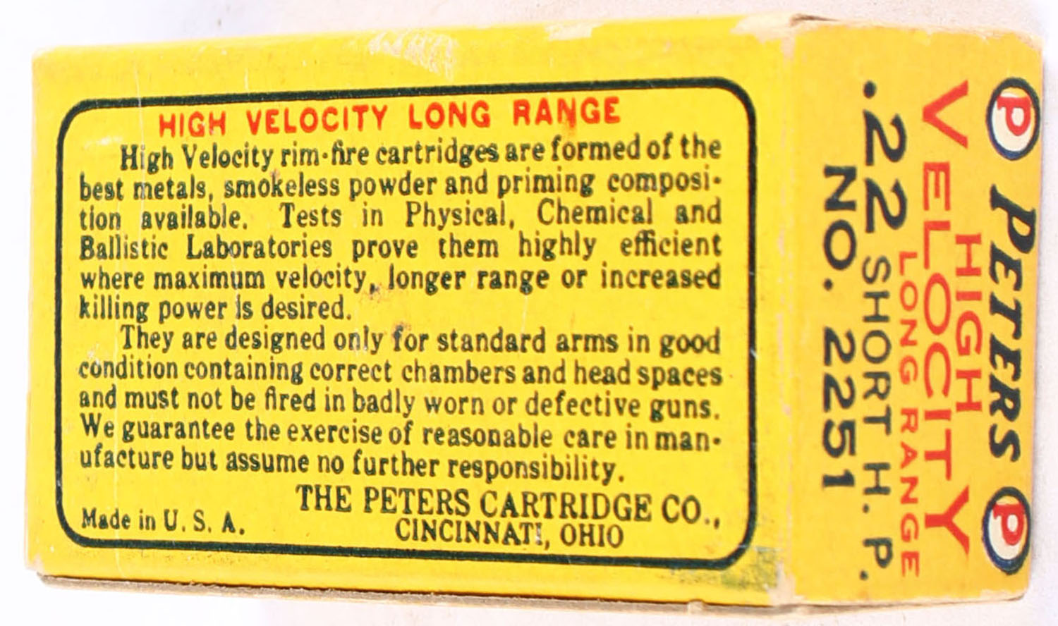 Peters, High Velocity Long Range, .22 Short Hollow Point, Rustless-Gildkote, RHWeb: PCC-11A S-2a, Full, 1pc. Yellow blue & red box, box is near mint with minty color, only very minor corner wear, edges are crisp, end flaps are solid, ammo is excellent to minty. Grade: Excellent ++ - Value: 120 to 180