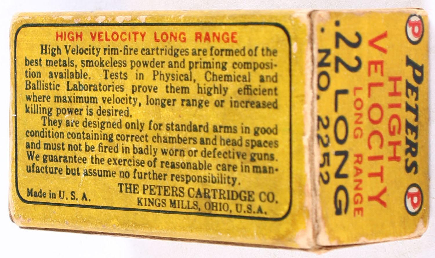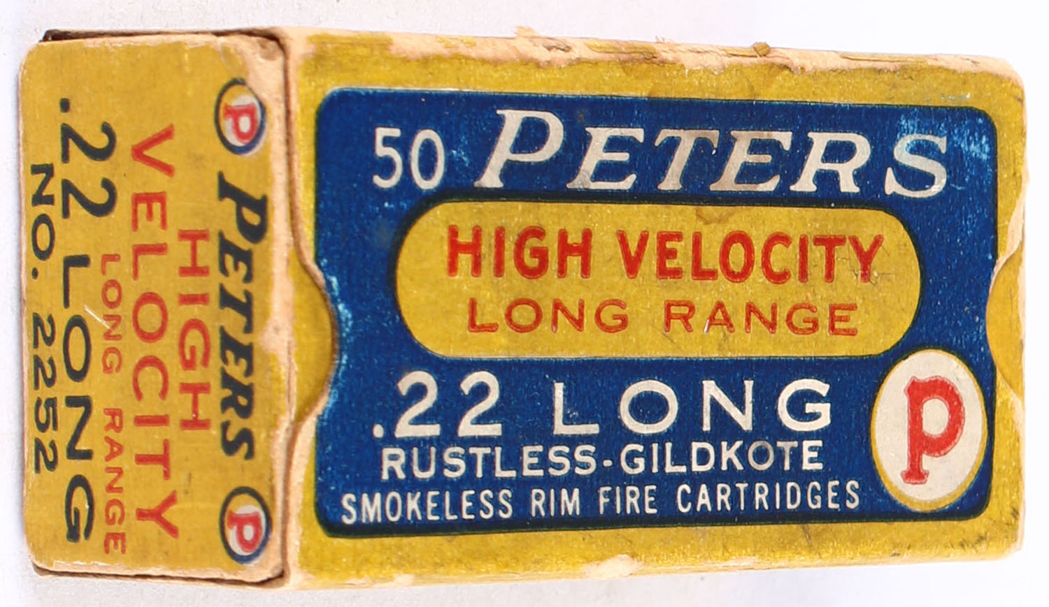 Peters, High Velocity Long Range, .22 Long Rustless-Gildkote, RHWeb: PCC-11A L-1b, Full, 1pc. Blue yellow & red box, box is solid with very good color, some age soiling, minor edge & corner wear, end flaps are solid, ammo is very good to excellent. Grade: Very Good ++ - Value: 60 to 90