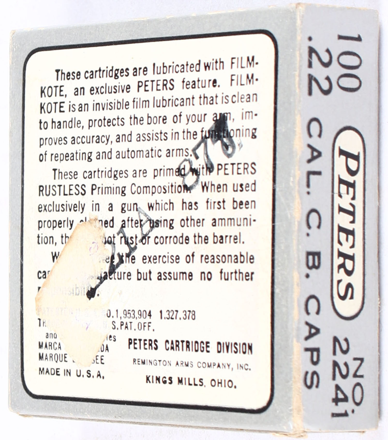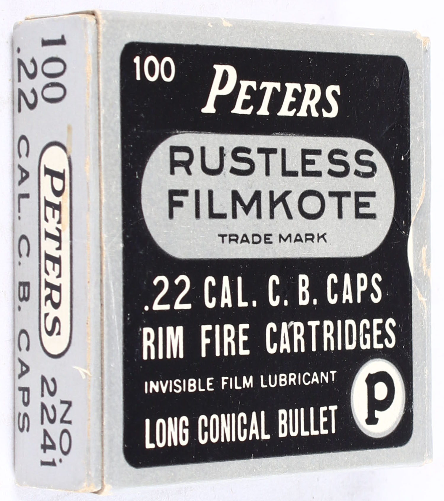 Peters, Rustless Filmkote, .22 C.B. Caps, RHWeb: PCC-12 CB-2f, Full, 1pc. Black & silver box, box is solid with minty color, very minor edge & corner wear, end flaps are solid, ammo is excellent. Grade: Excellent + - Value: 150 to 225